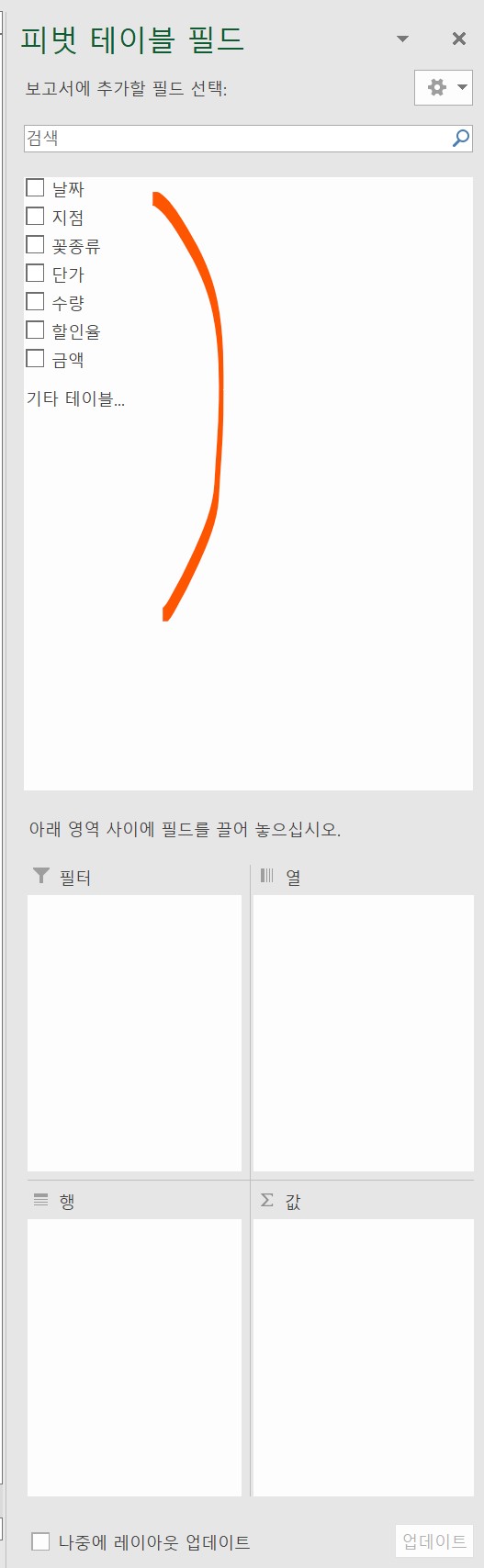 다음은 피벗 테이블 필드 목록에서 필드를 선택해 레이아웃을 구성해보겠다.