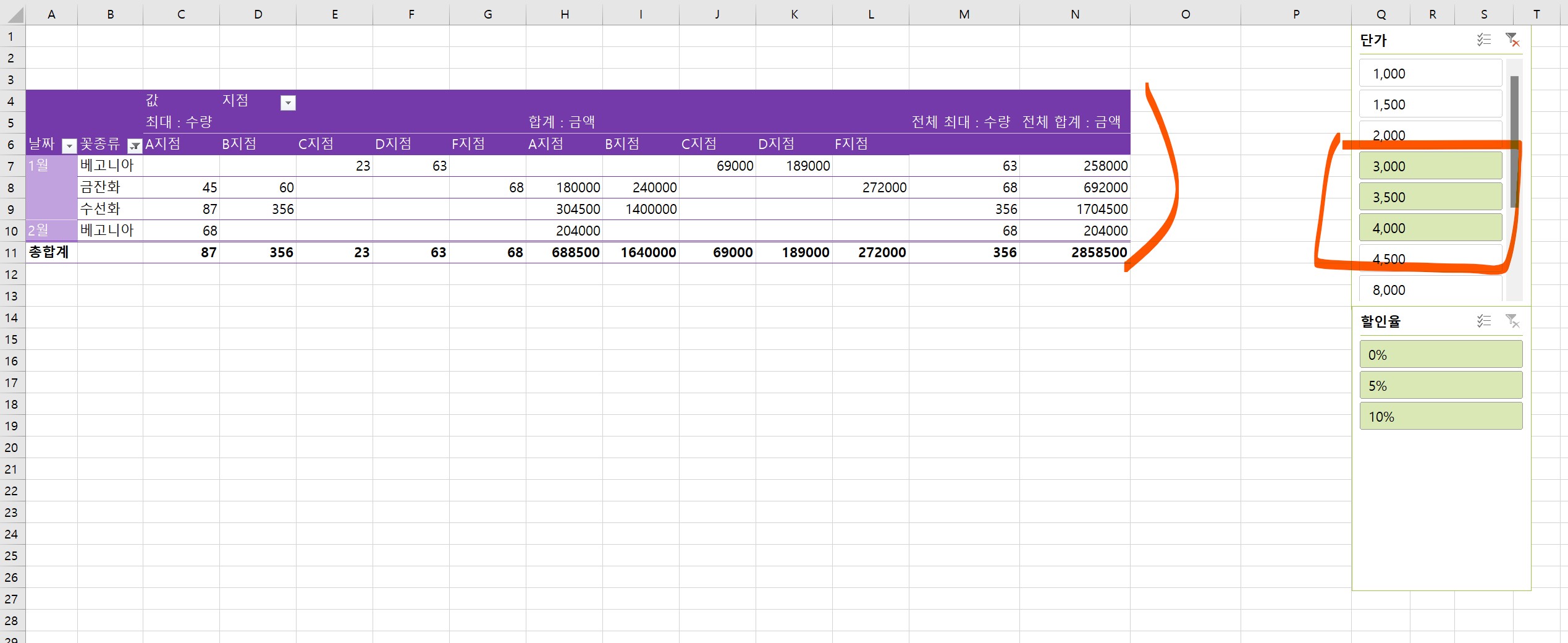 4. 단가와 할인율 슬라이서가 삽입되었다.