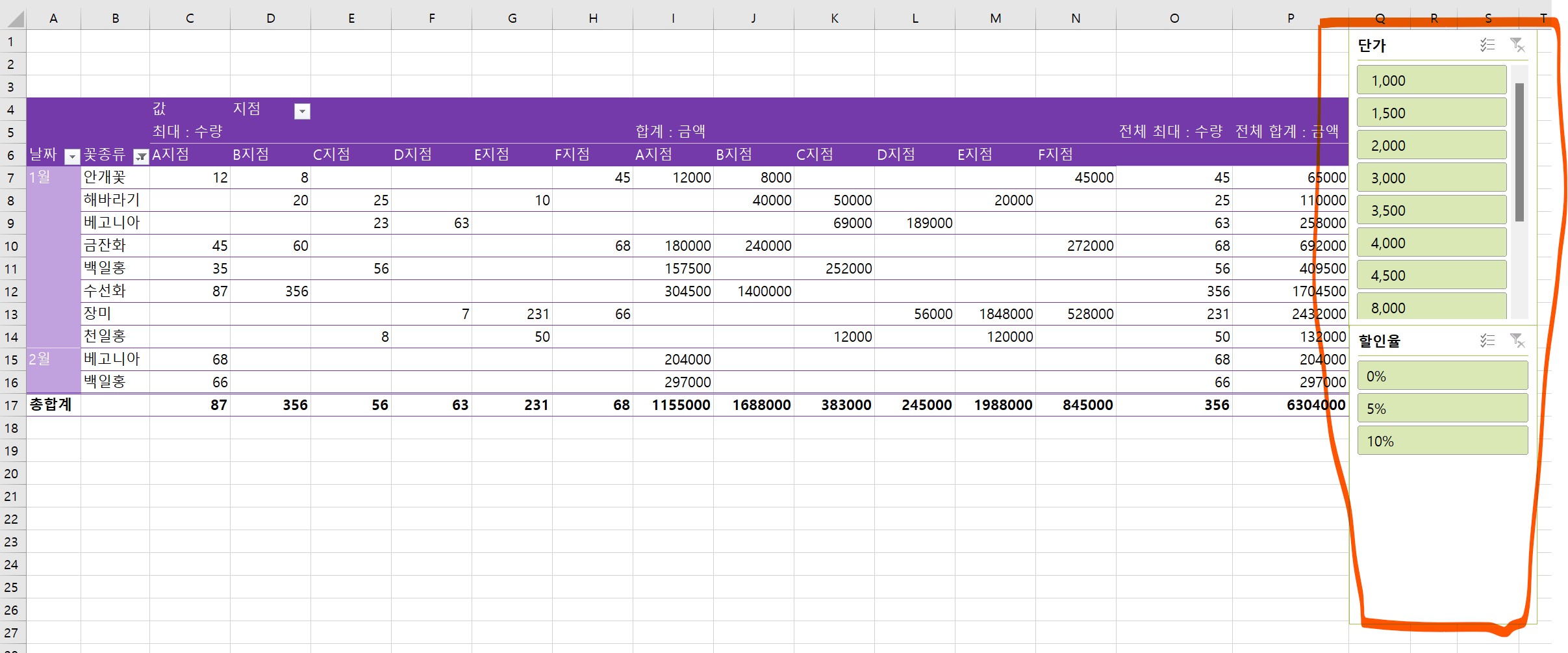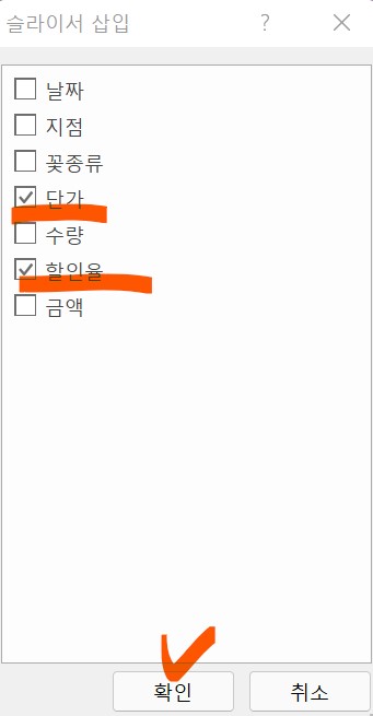 4. 단가와 할인율 슬라이서가 삽입되었다.