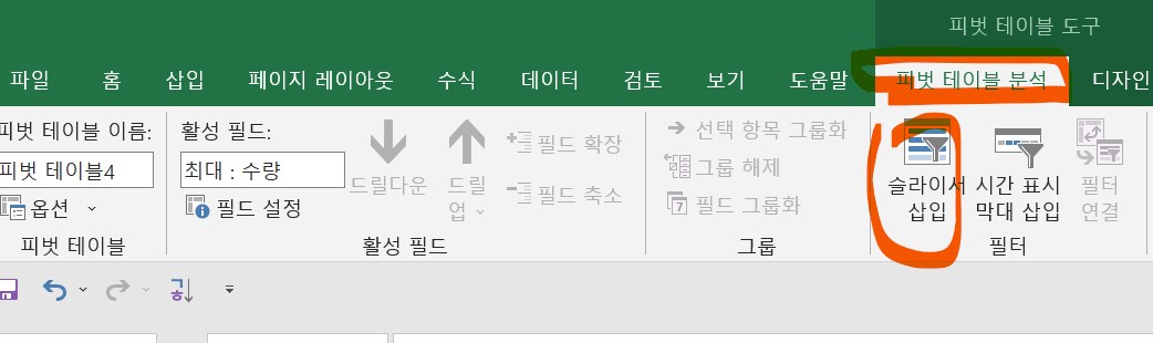 2. [피벗 테이블 도구] -> [피벗 테이블 분석] -> [필터] -> [슬라이서 삽입] 아이콘을 클릭한다.