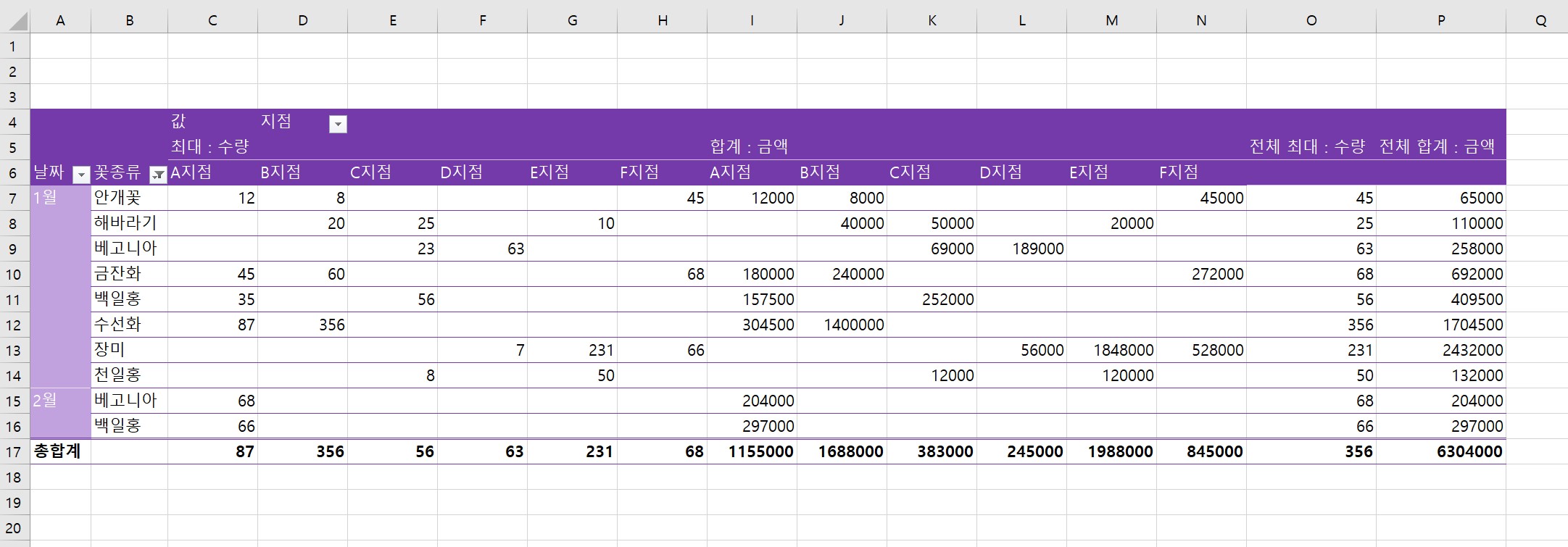초록색으로 선택된 데이터만 피벗테이블이 변화되면서 데이터가 보여지게 된다.
