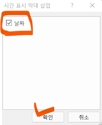3. [시간 표시 막대 삽입] 새창에서 기준이 되는 목록을 선택한다.