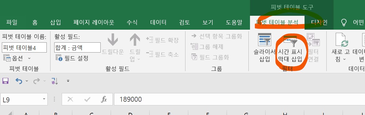 2. [피벗 테이블 도구]메뉴에서 [피벗 테이블 분석]을 선택한다. -> [필터] -> [시간 표시 막대 삽입] 아이콘을 클릭한다.
