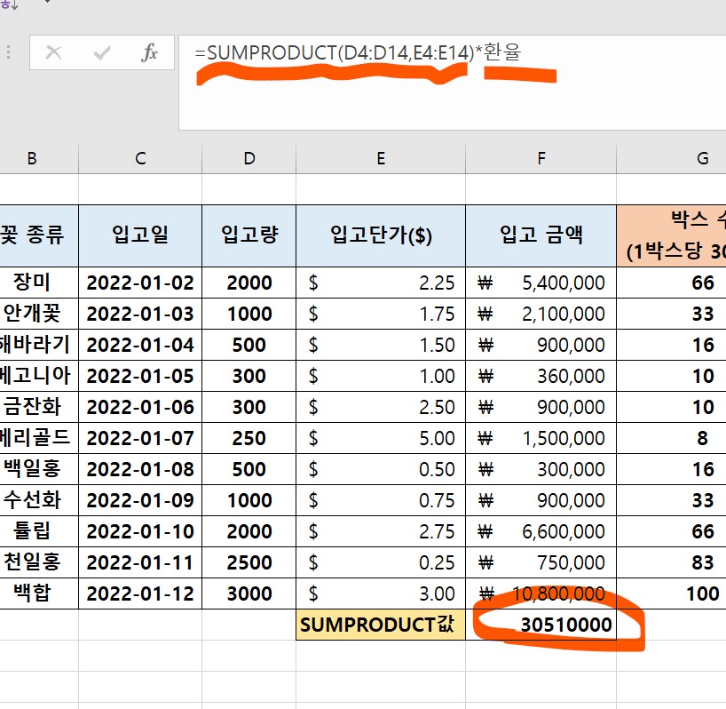 입고량*입고단가를 곱한값들을 한번에 더할 수 있는 함수다.