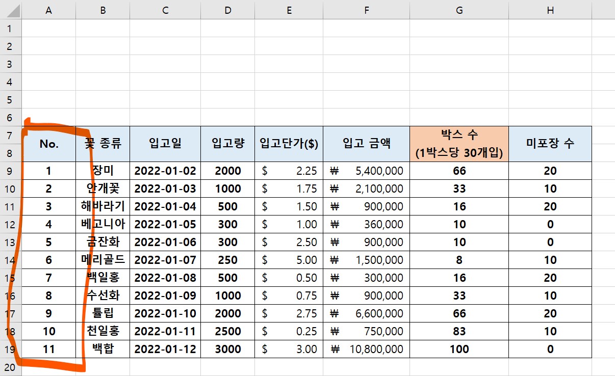 행의 위치에 따라 자동으로 8을 빼서 번호가 입력되었다.
