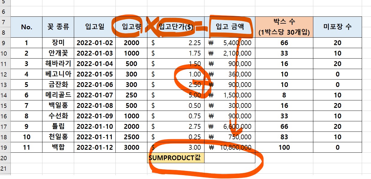 SUMPRODUCT는 두개를 곱한 것을 합한 값이다.