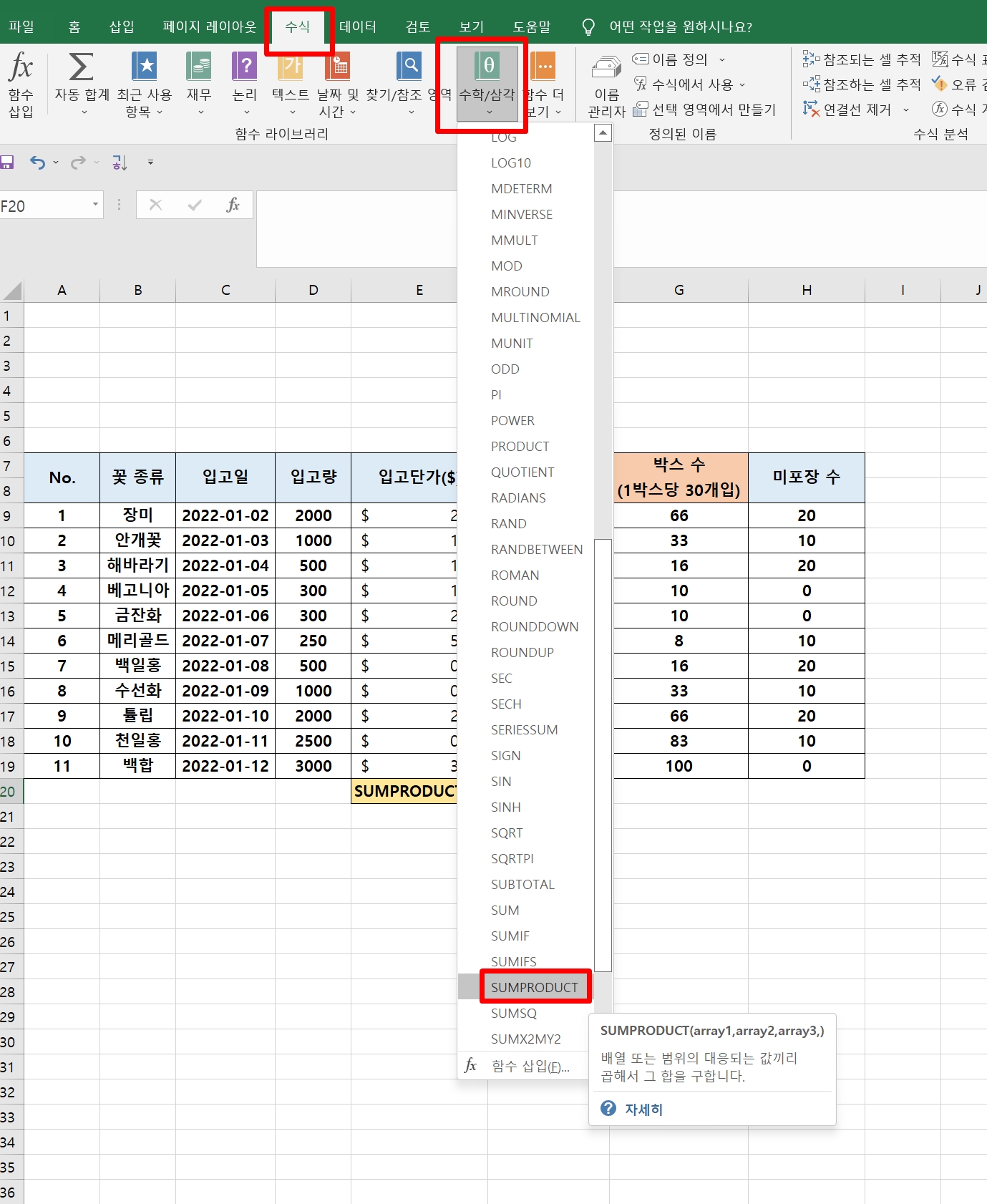 1. [수식] -> [함수 라이브러리] -> [수학/삼각] -> [SUMPRODUCT] 클릭한다.
