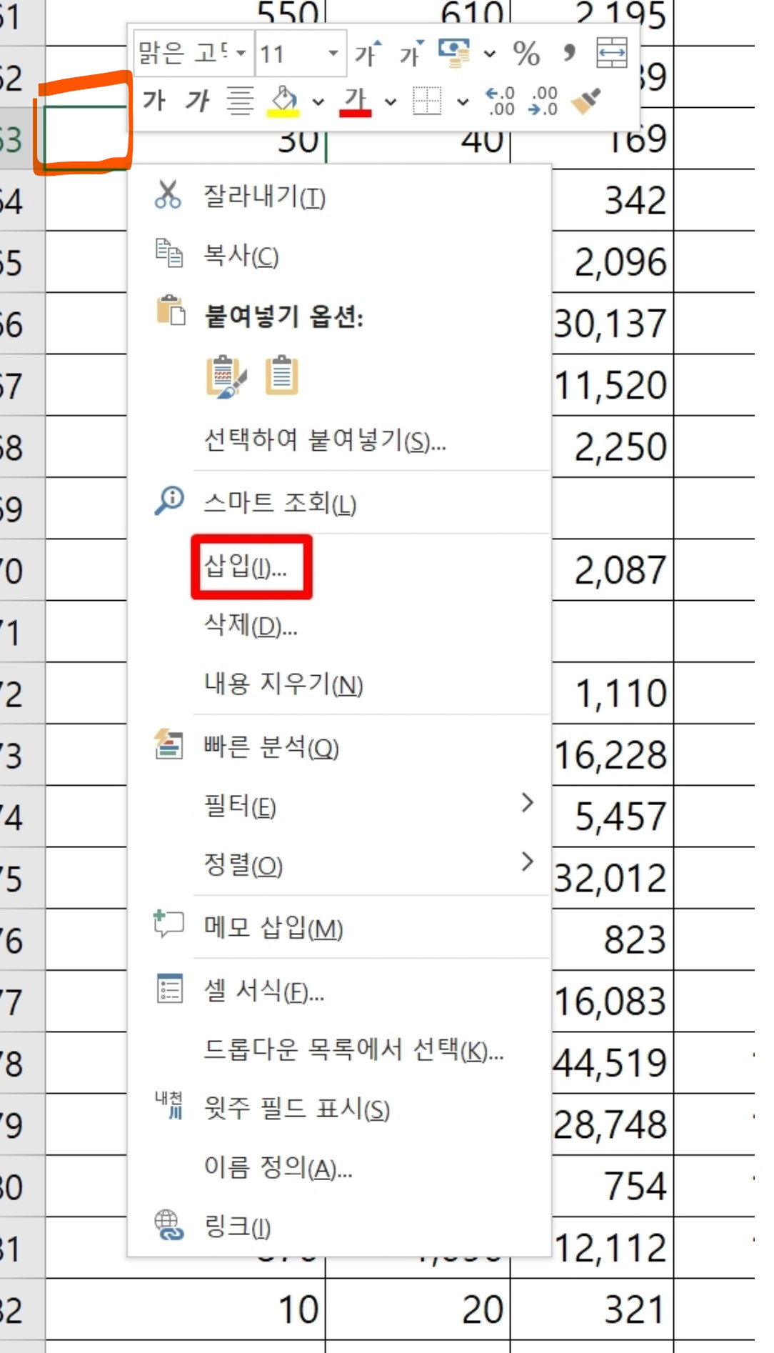 행 열 삽입 방법 1. 마우스 오른쪽 버튼으로 삽입