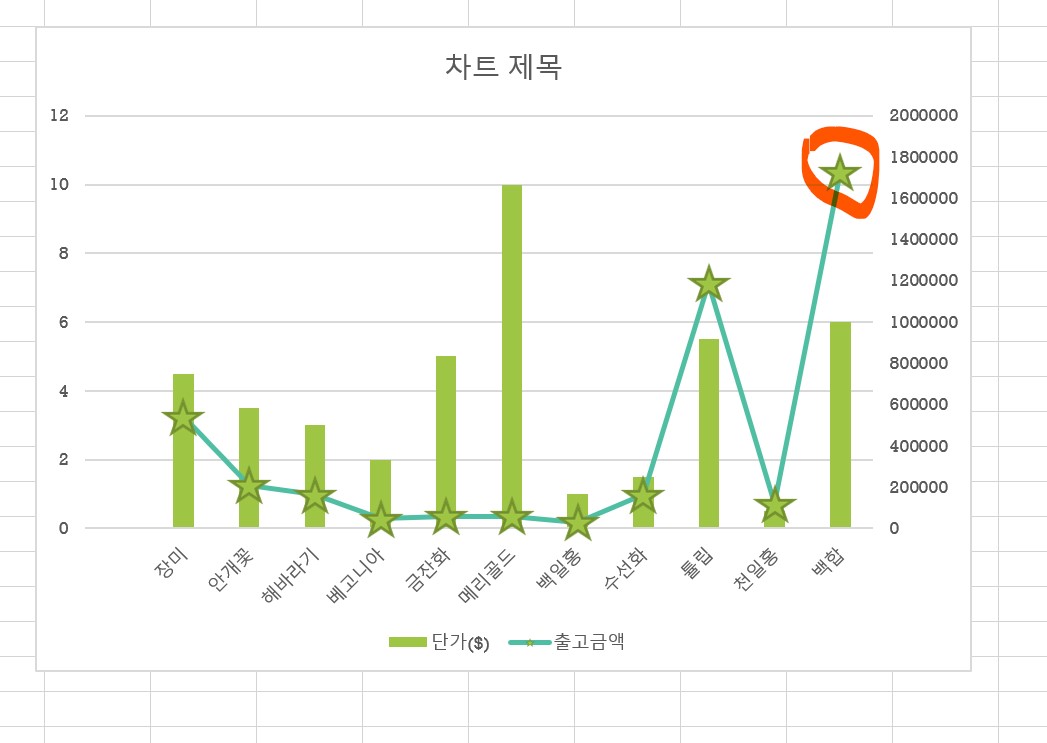 위의 표에서, 꽃종류, 단가, 출고금액을 바탕으로 막대 그래프를 먼저 만들고 그 후에 꺾은선 그래프를 혼합차트로 표시해보려고 한다.