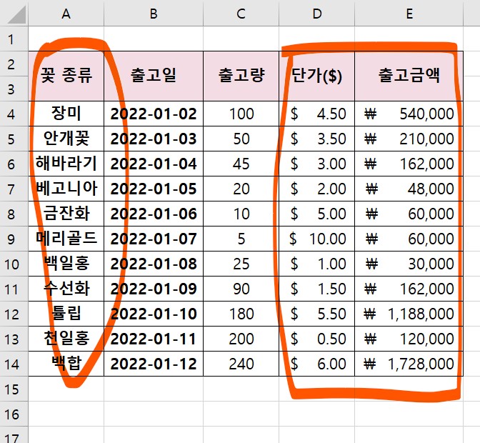 1. 꽃종류, 단가, 출고금액 셀을 블락지정한다.