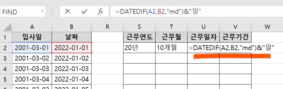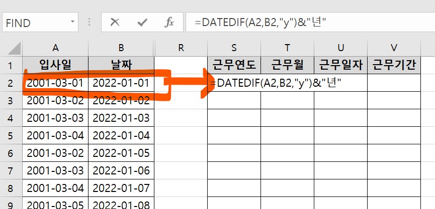 시작날짜는 입사일, 종료날짜는 날짜에 있는 날짜, 옵션조건은 연도로 표시할꺼라 "y"로 표시하고, 여기에 년이라고 표시하고 싶어 직접 &"년" 이라 입력했다.