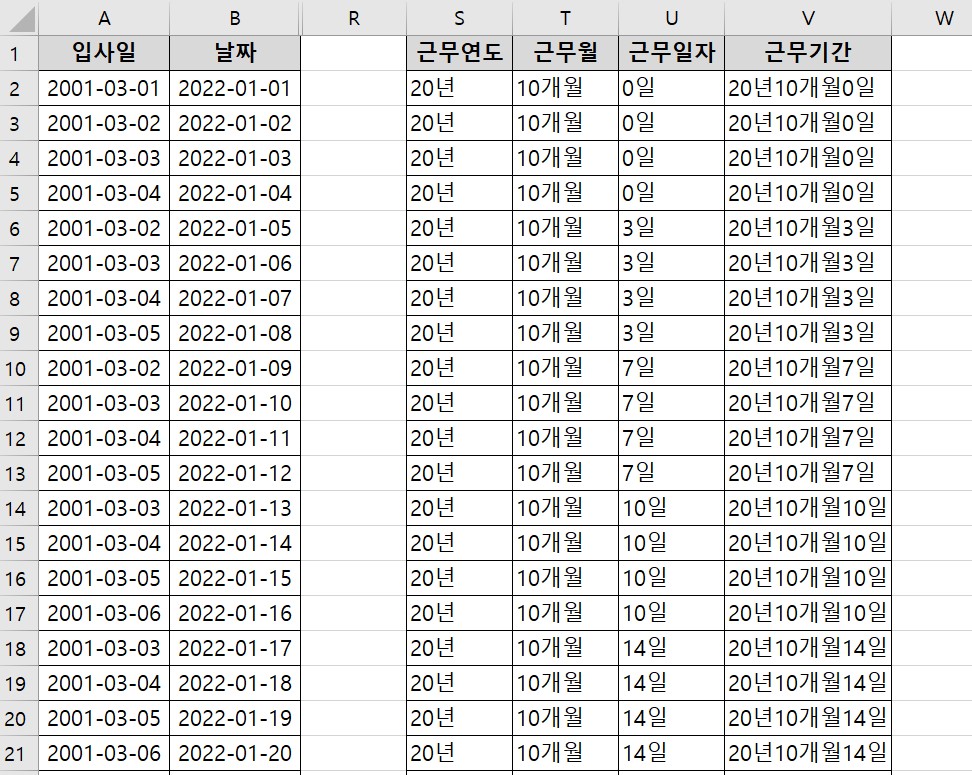 결과에서 보면, 20년을 근무했는데, 근무월이 10개월밖에 안되고, 근무일자는 0일이다.