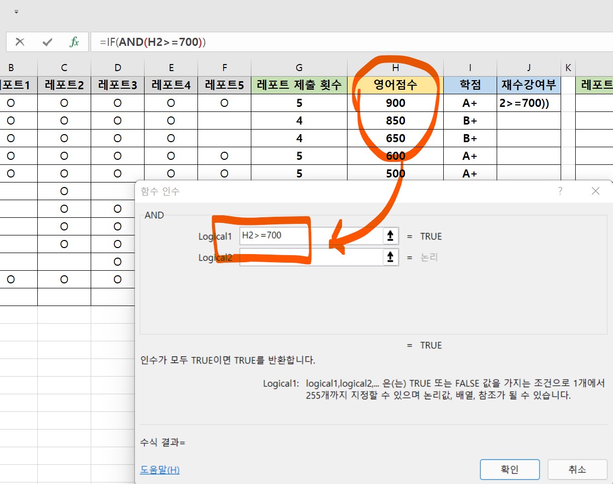 학점이 A+나 B+이고 영어점수가 700점 이상일 때는 재수강여부에 통과, 그렇지 않을 때는 재수강을 표시하는 함수식을 만들어보려고 한다.