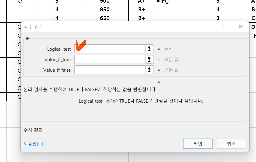 3. [함수인수]창에서 [Logical_test]의 빈칸을 클릭한다.