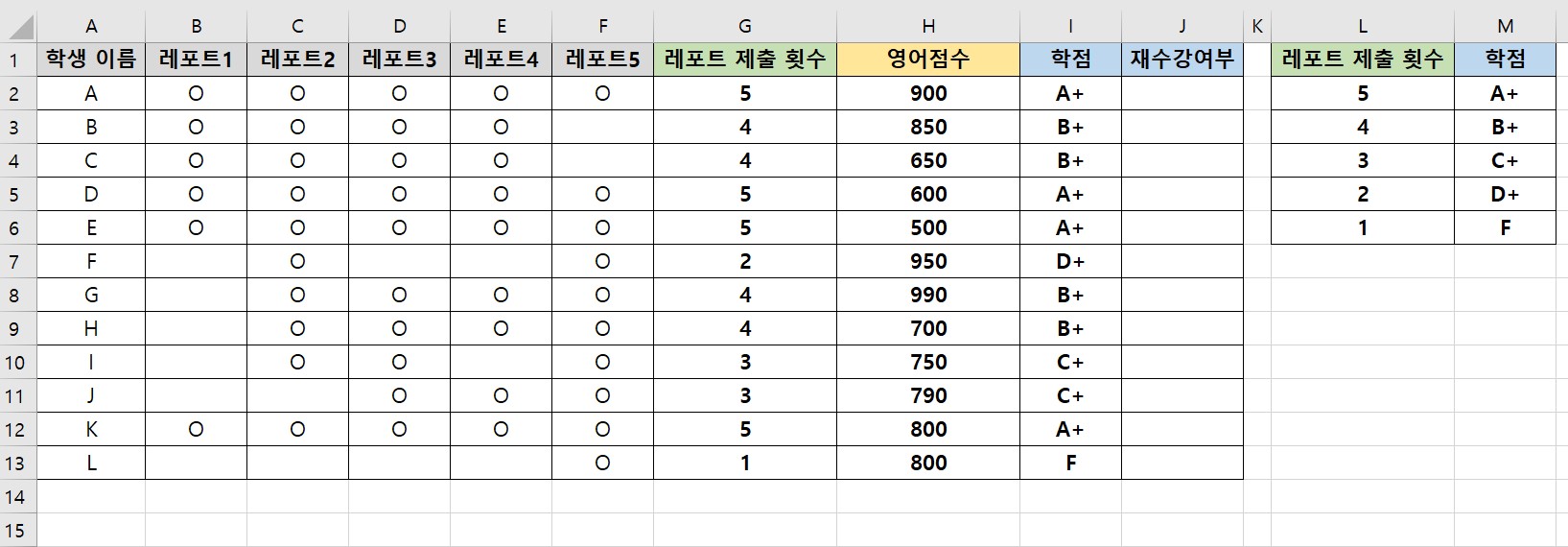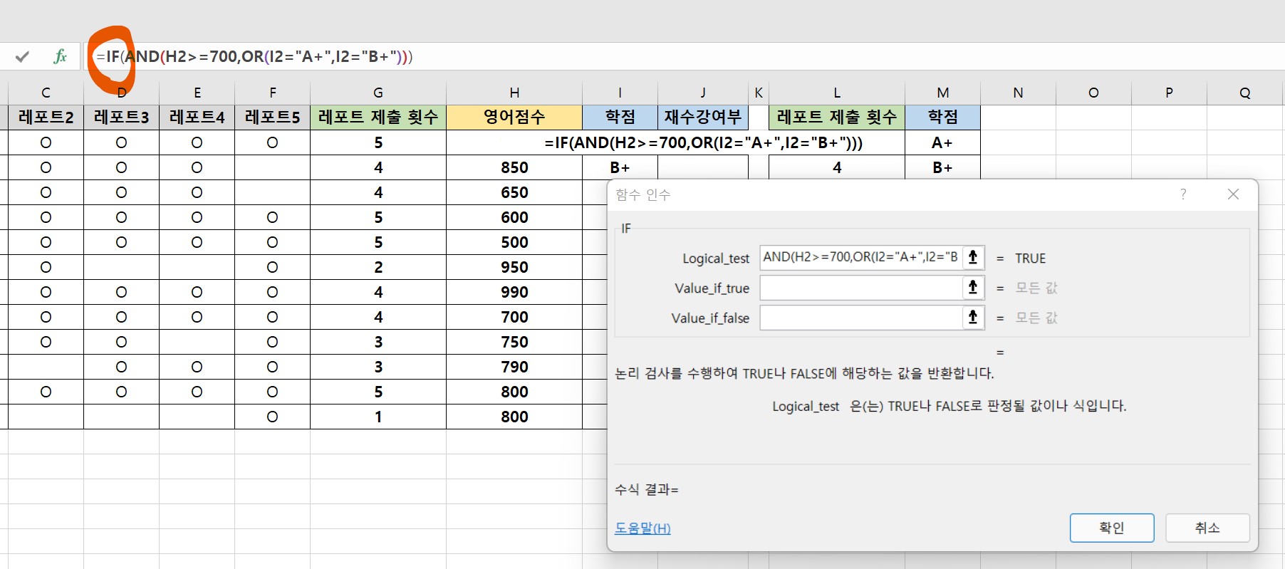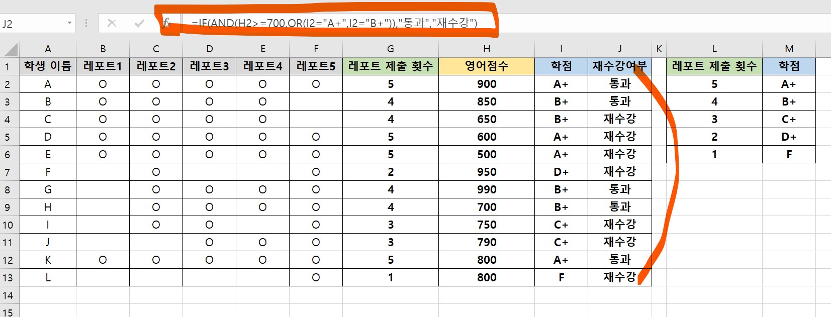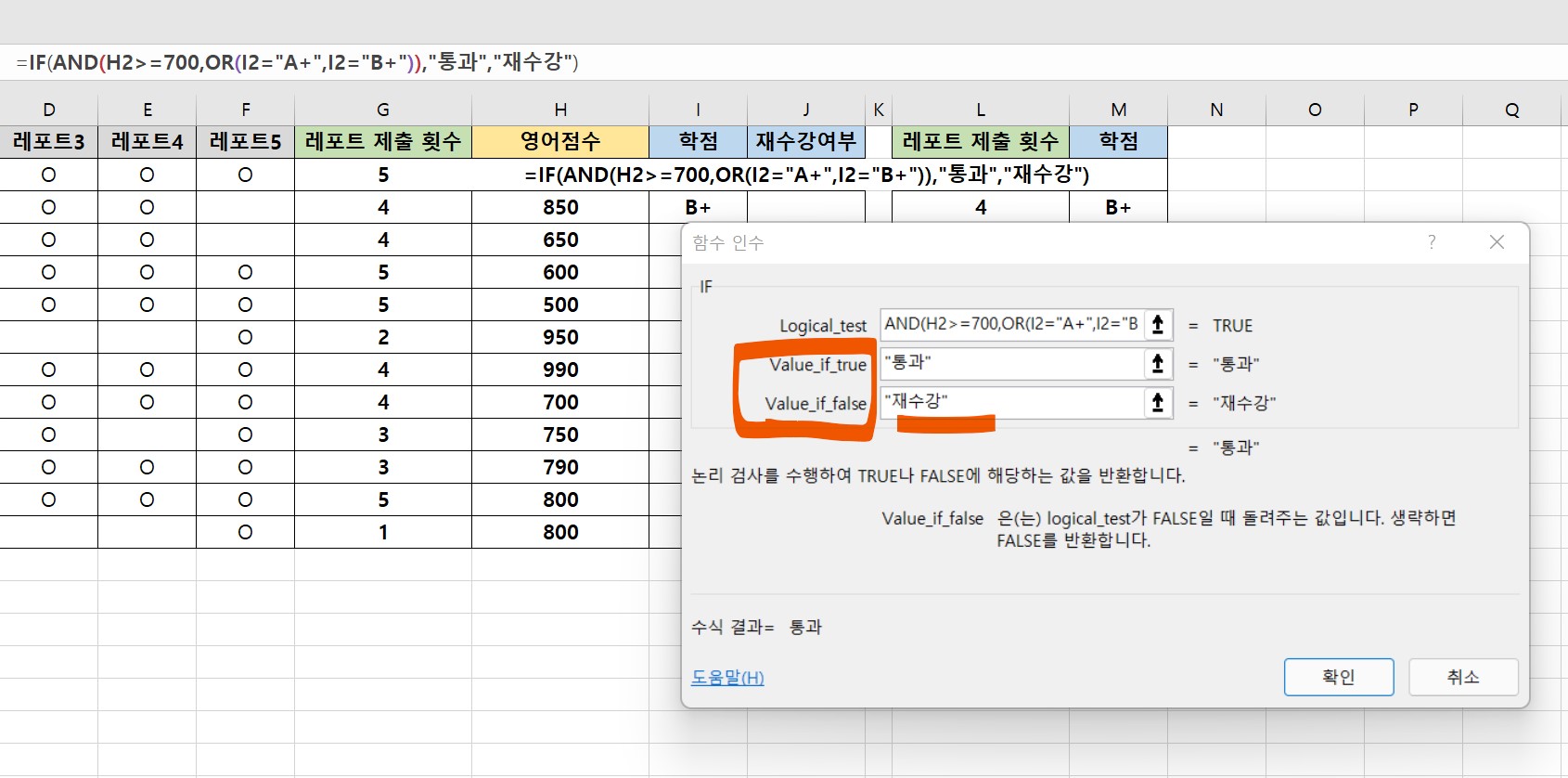 학점이 A+나 B+이고 영어점수가 700점 이상일 때는 재수강여부에 통과, 그렇지 않을 때는 재수강을 표시하는 함수식을 만들어보려고 한다.