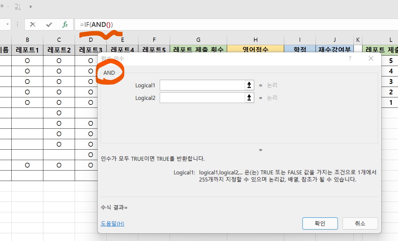 8. AND 함수인수창에서 [Logical1]의 빈칸에 조건을 입력한다.