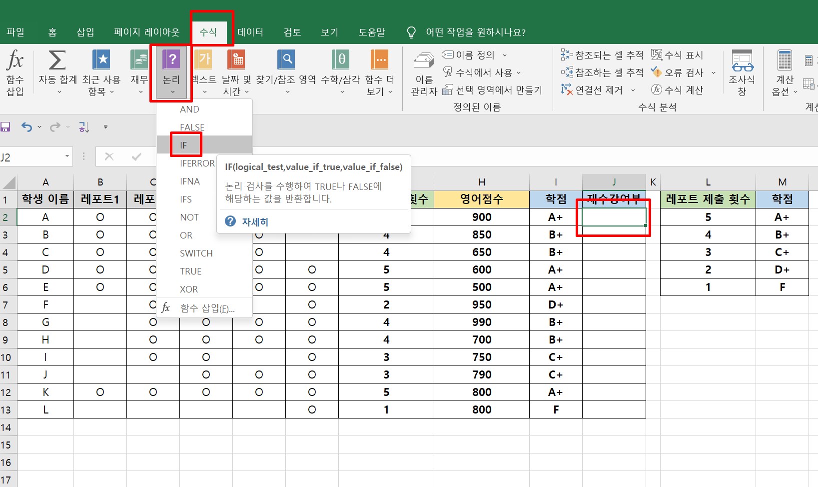 여기에서는 재수강여부 셀에 결과를 표시할 예정이므로 [J2셀]을 클릭했다.