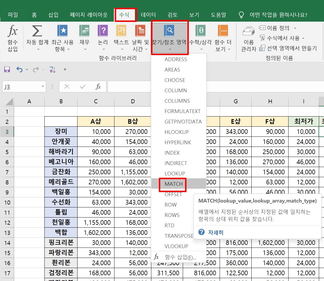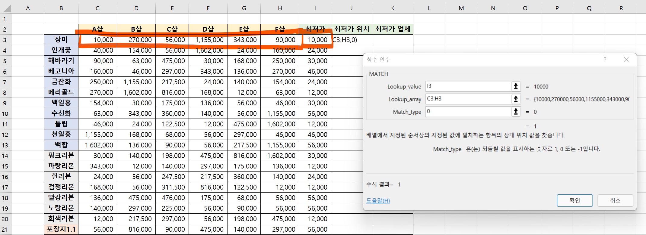 엑셀 MATCH 함수로 최저가가 있는 위치 찾는 방법