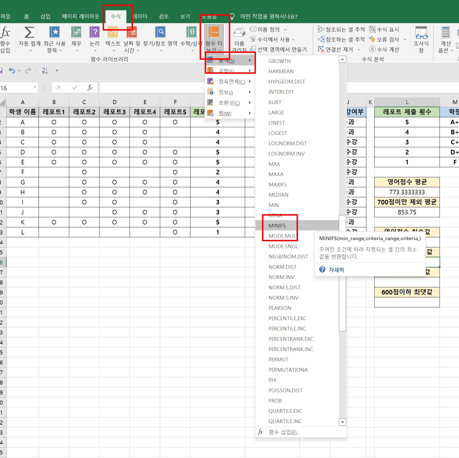 2. [수식] -> [합수 라이브러리] -> [함수 더 보기] -> [통계] -> [MINIFS]를 클릭한다.
