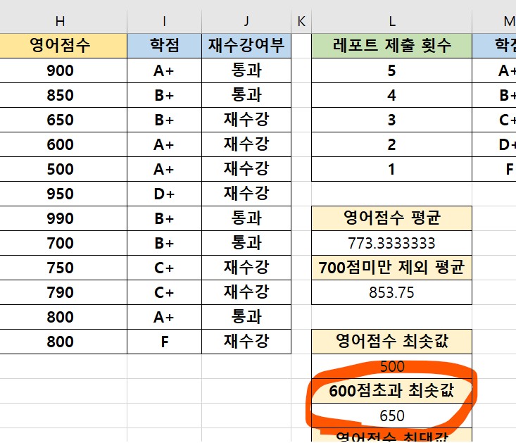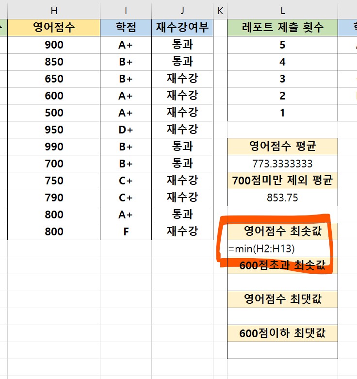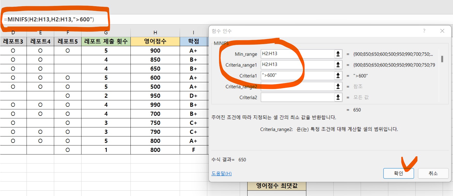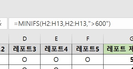 3. 다음으로 MINIFS함수를 이용해 지정한 범위내에서 600점 이하를 제외했을 때 가장 작은 최솟값을 구해보려고 한다.
