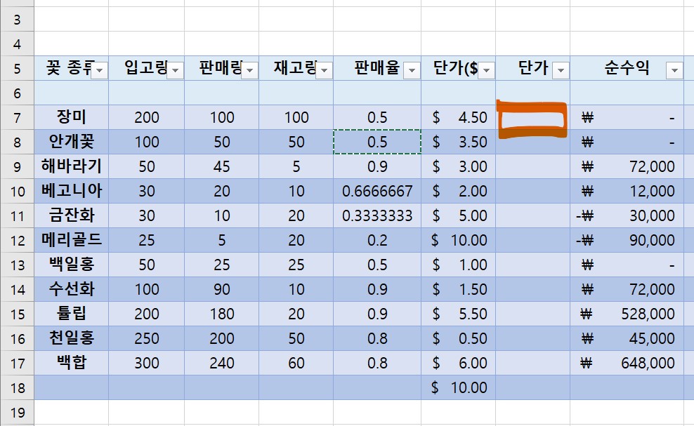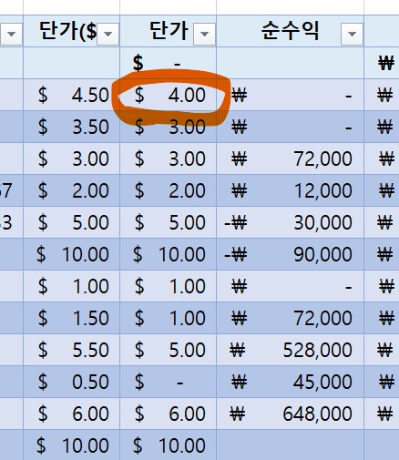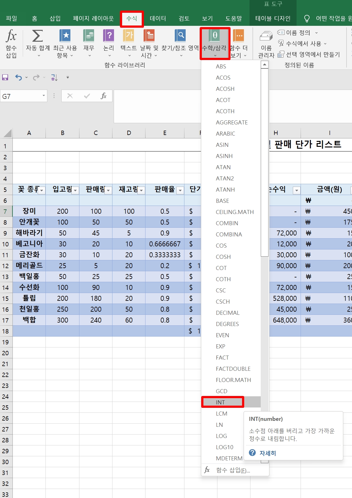 단가를 소수점은 버리고, 정수로 내림하는 INT를 적용해 보겠다.