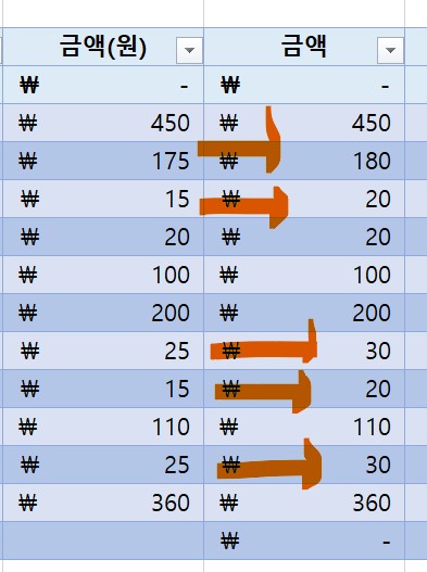 금액 중 일의자리는 잘 안사용하기 때문에, 십의자리까지 표시하거나