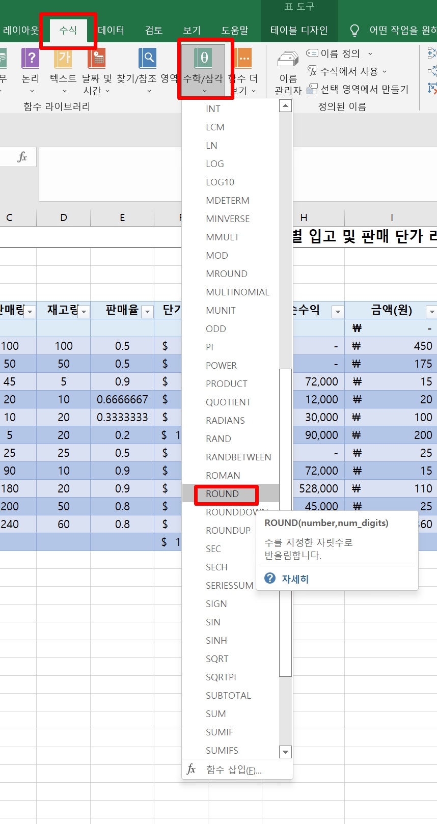 2. [수식] -> [수학/삼각] -> ROUND 클릭한다.