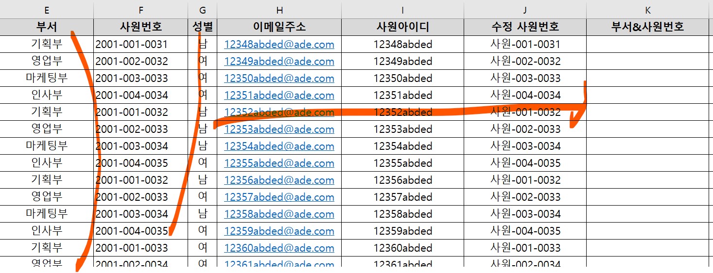 부서와 사원번호를 - 기호를 삽입하여 연결해보려고 한다.