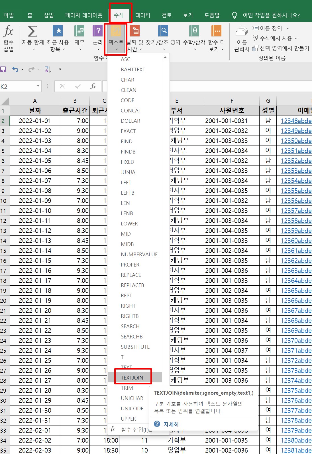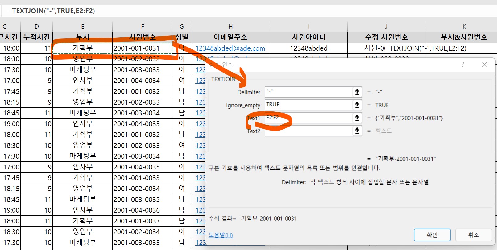 TEXTJOIN함수로 부서명과 사원번호를 연결시키는 방법