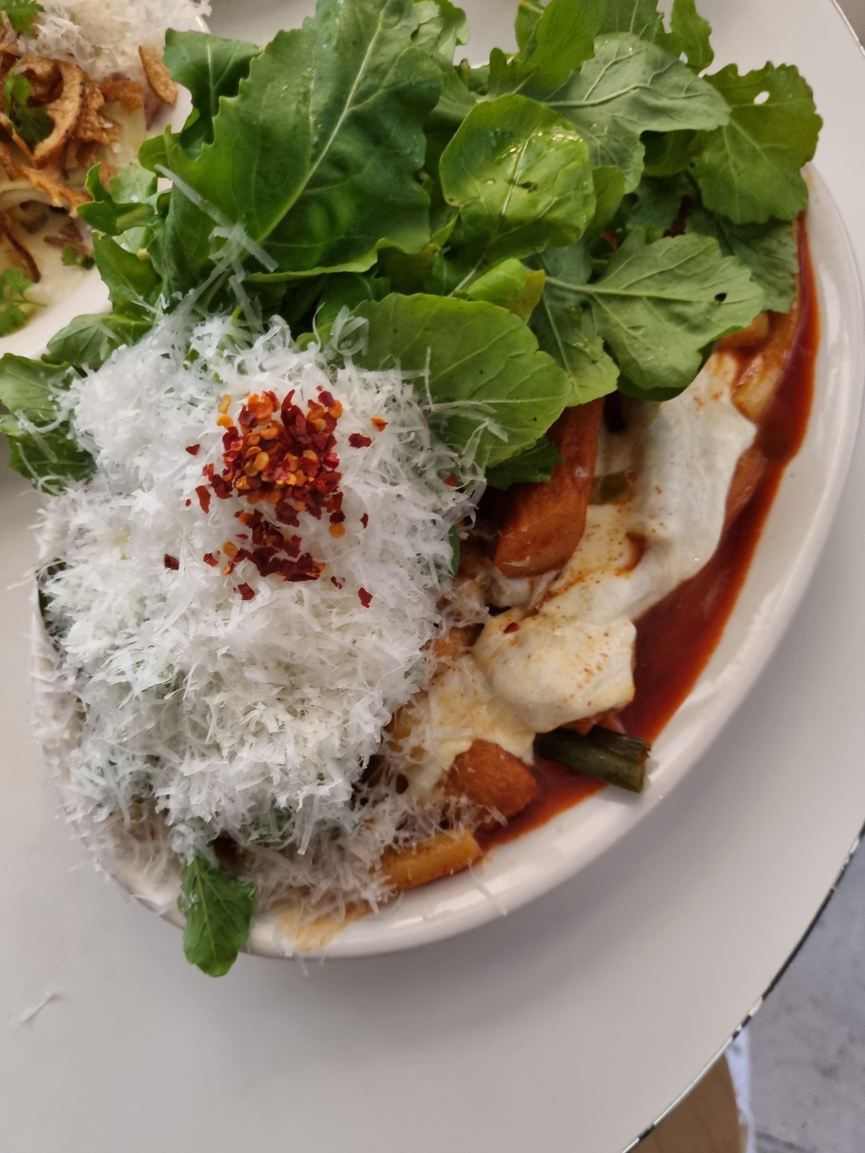 오뎅 가득 떡볶이에 치즈를 올리고 그 위에 루꼴라를 듬뿍 올렸다.