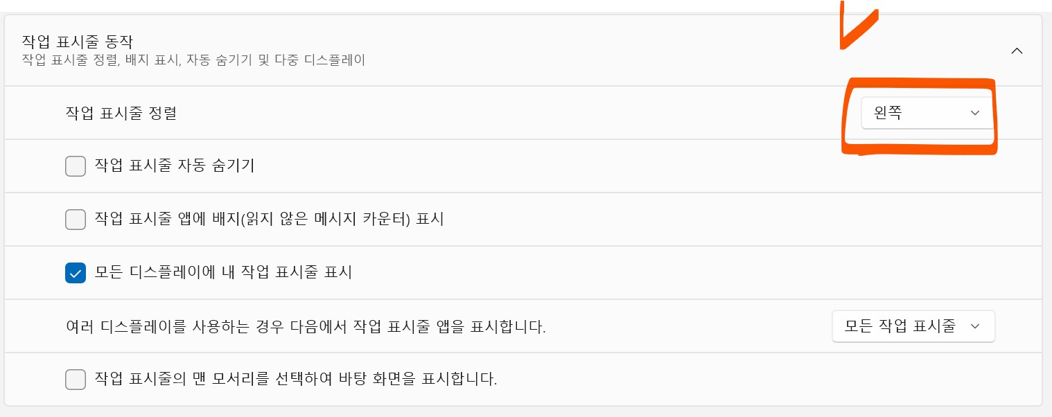 [작업 표시줄 정렬]의 오른쪽 끝에 화살표로 [왼쪽] 또는 [가운데] 선택이 가능하다.