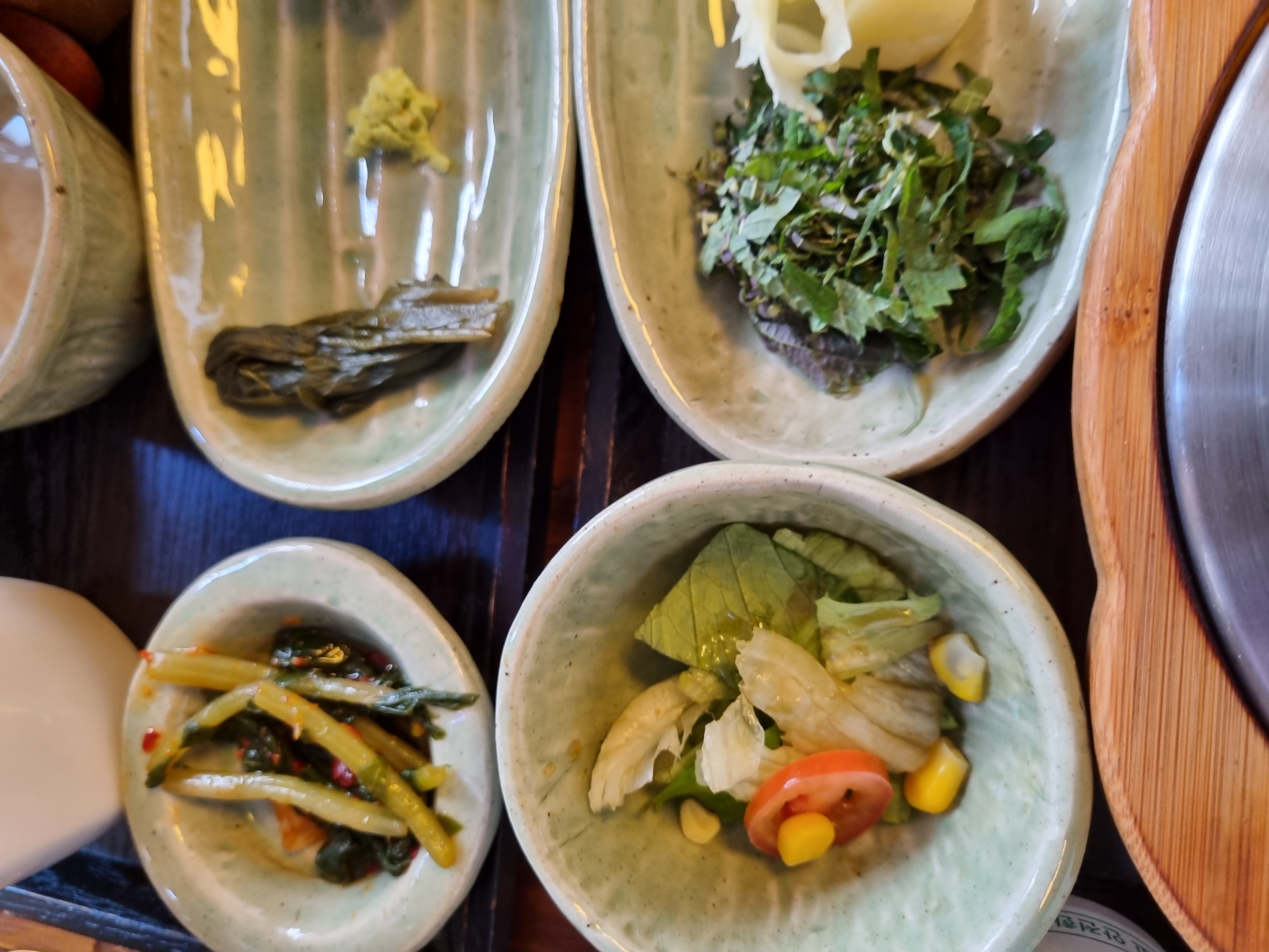 샐러드와 김치, 장아찌, 와사비, 깻잎 등이 같이 서빙되어 솥밥과 함께 곁들어 먹기 좋게 나온다.
