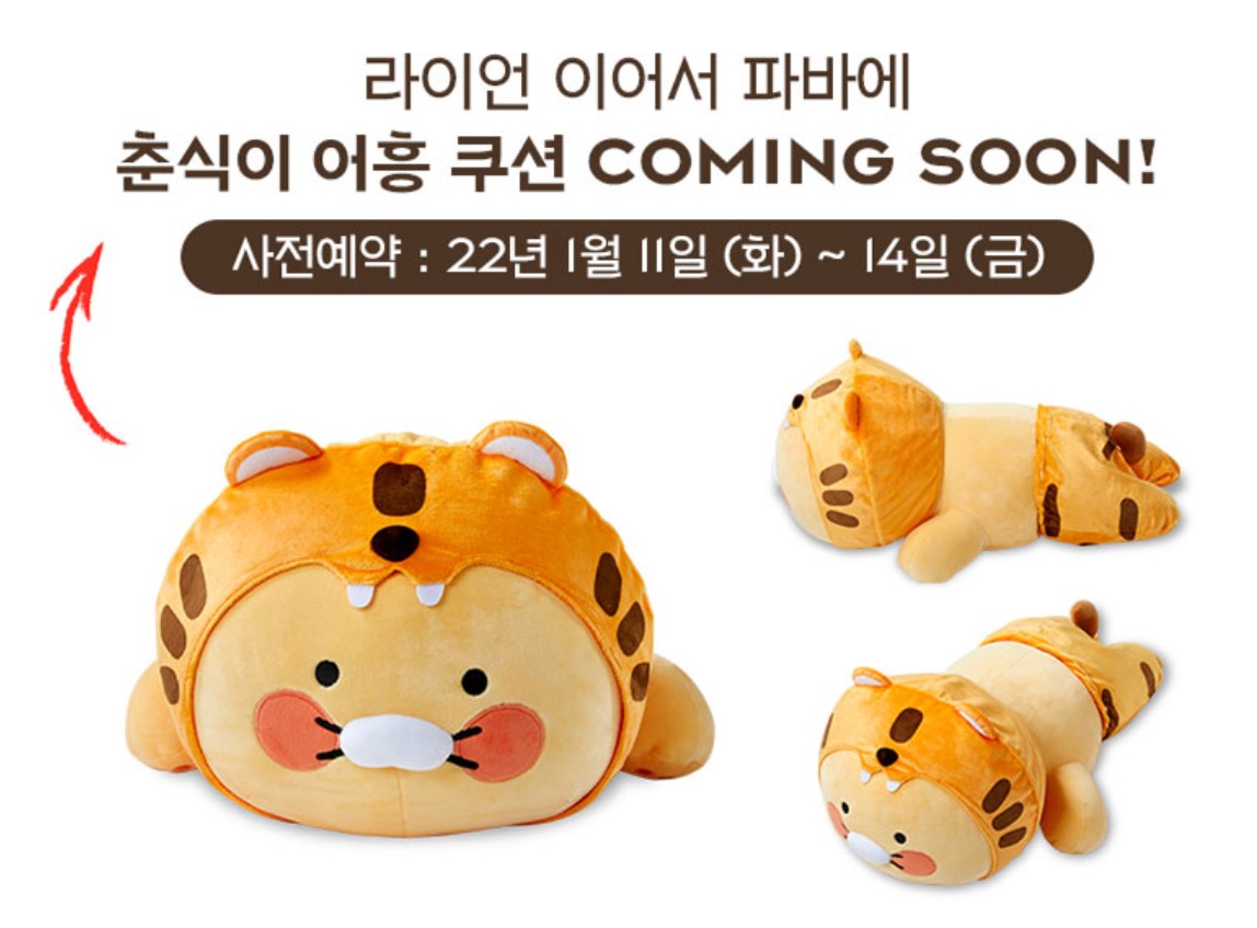 파바에서는 춘식이 인형도 출시한다. '춘식이 어흥 쿠션'이라고 명명한 이 쿠션은 현재 케이크 구매자들에게 이벤트도 준비중이다. 11일부터 14일까지 사전예약을 받고 있으니 관심있는 사람들은 참고할 것.