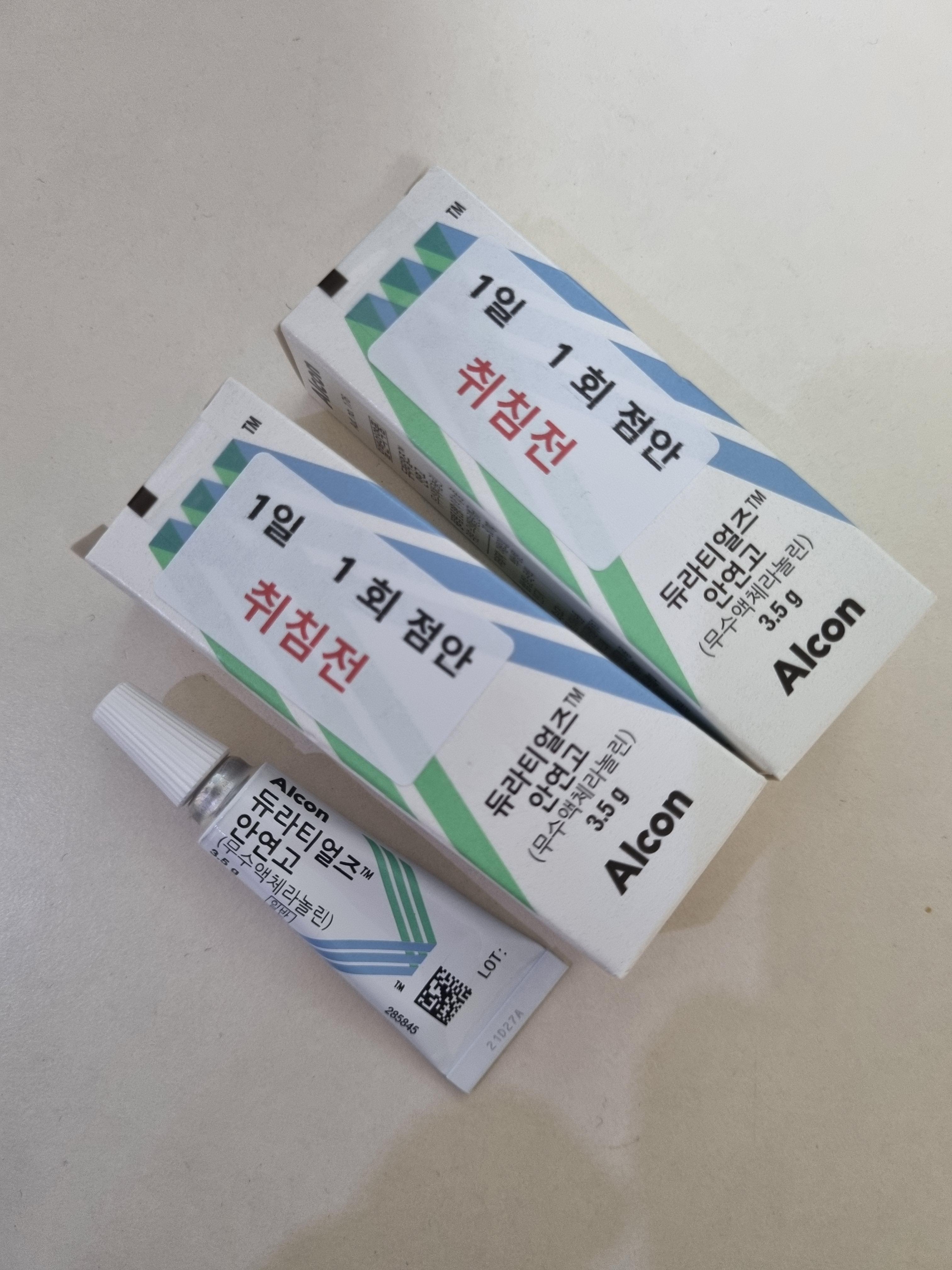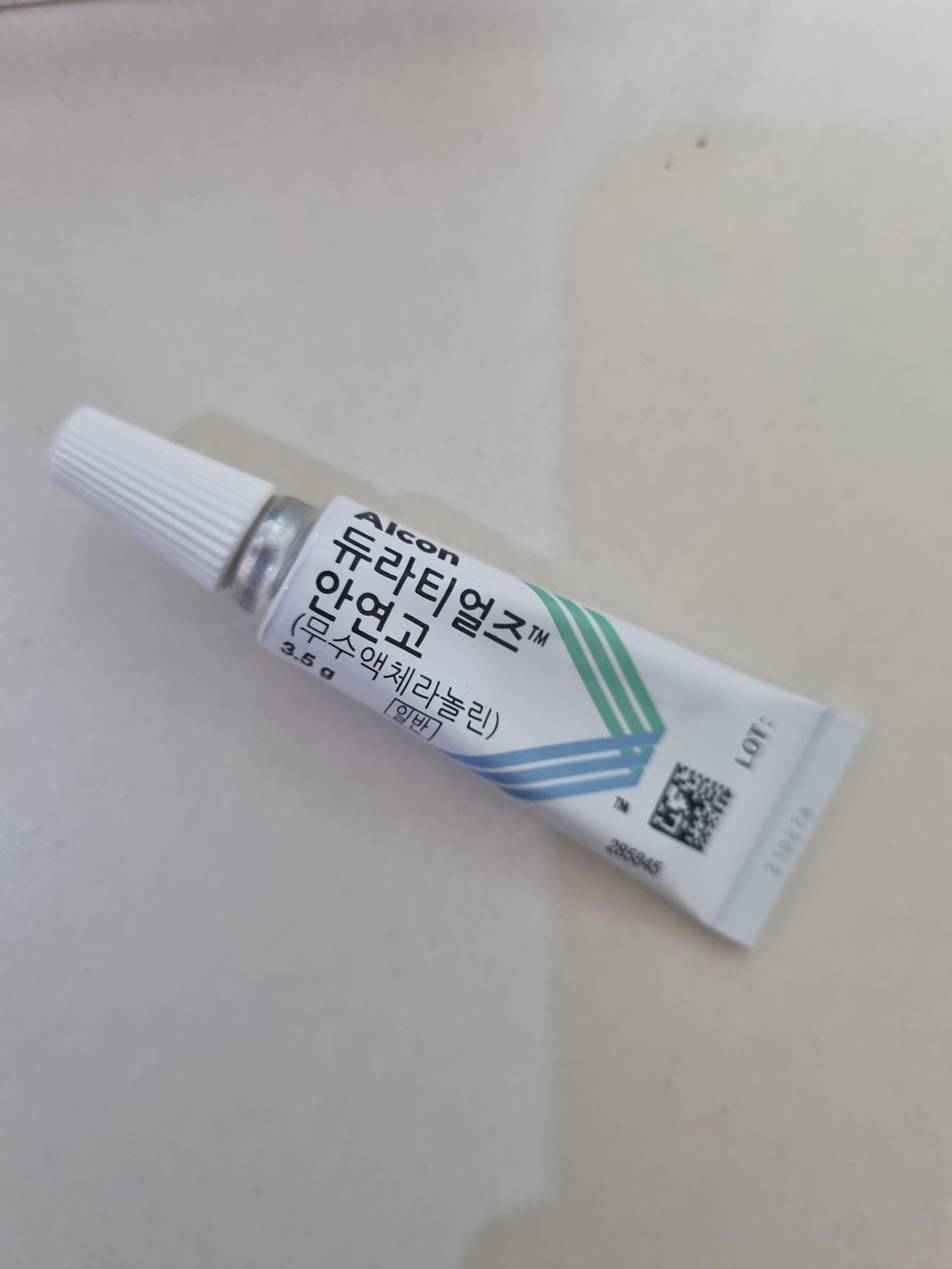 갑상선 안병증으로 안과에서 처방받은 듀라티얼즈 안연고. 매일 취침전 1일 1회 아래 눈커플 안쪽에 바르는 연고다. 일반 액체형 인공눈물보다 점성이 높아서 잘때 눈을 살짝 뜨고 잘 염려가 있어 눈을 보호하거나 눈을 부드럽게 하는 윤활제 역할을 한다.