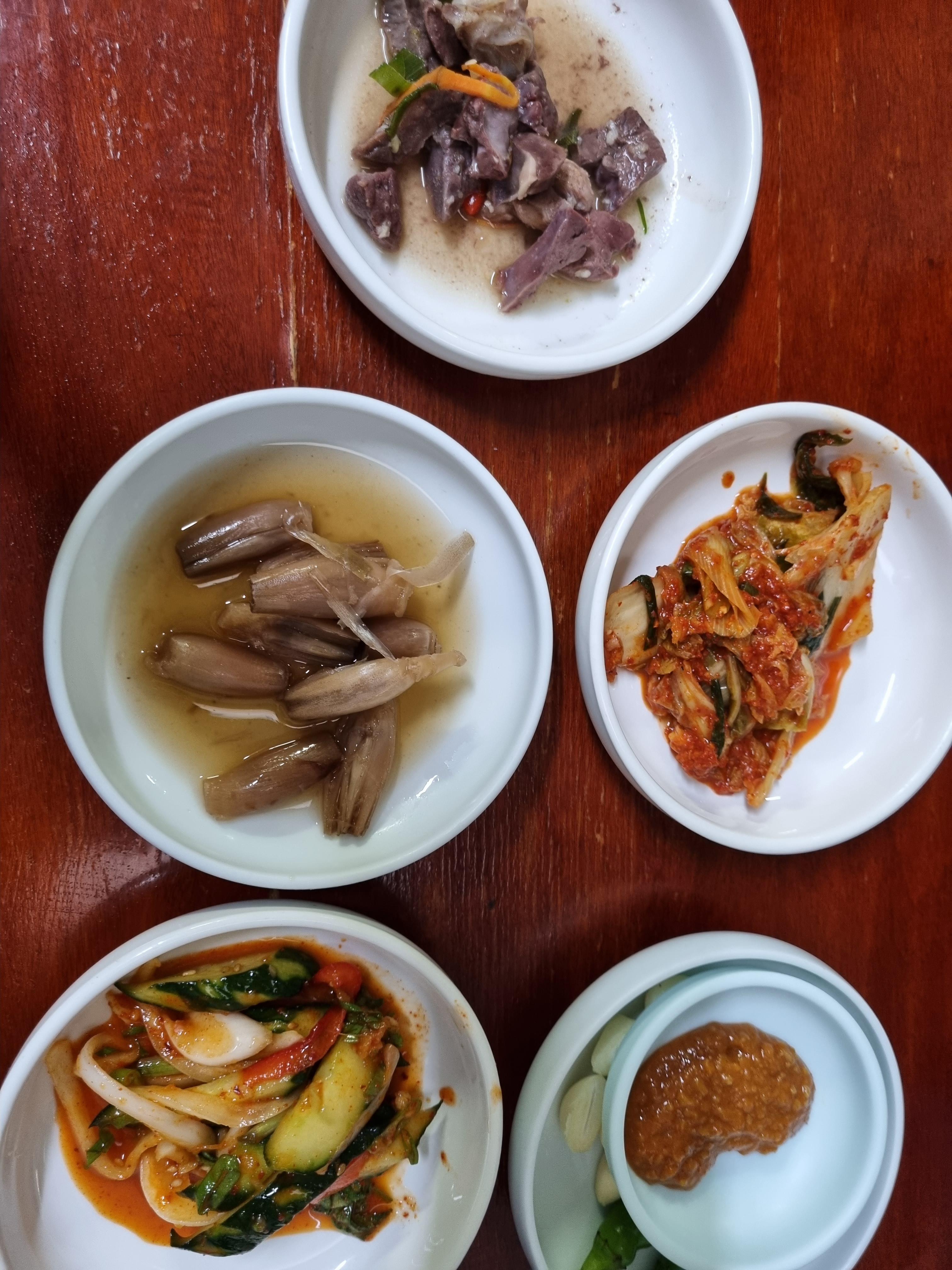 반찬은 허파반찬과 양파반찬이 나왔는데 신기했다. 일단 허파로 반찬을 만든다는 걸 처음 본 것 같았고, 저렇게 얇은 아이가 양파라고는 생각을 못했는데 양파란다. 왜 양파라고 생각을 못했냐면 엄청 쓴맛이 나기 때문이다. 그래도 뭔가 끌리는 맛이 있어서 다 먹게 되는 맛이었다.