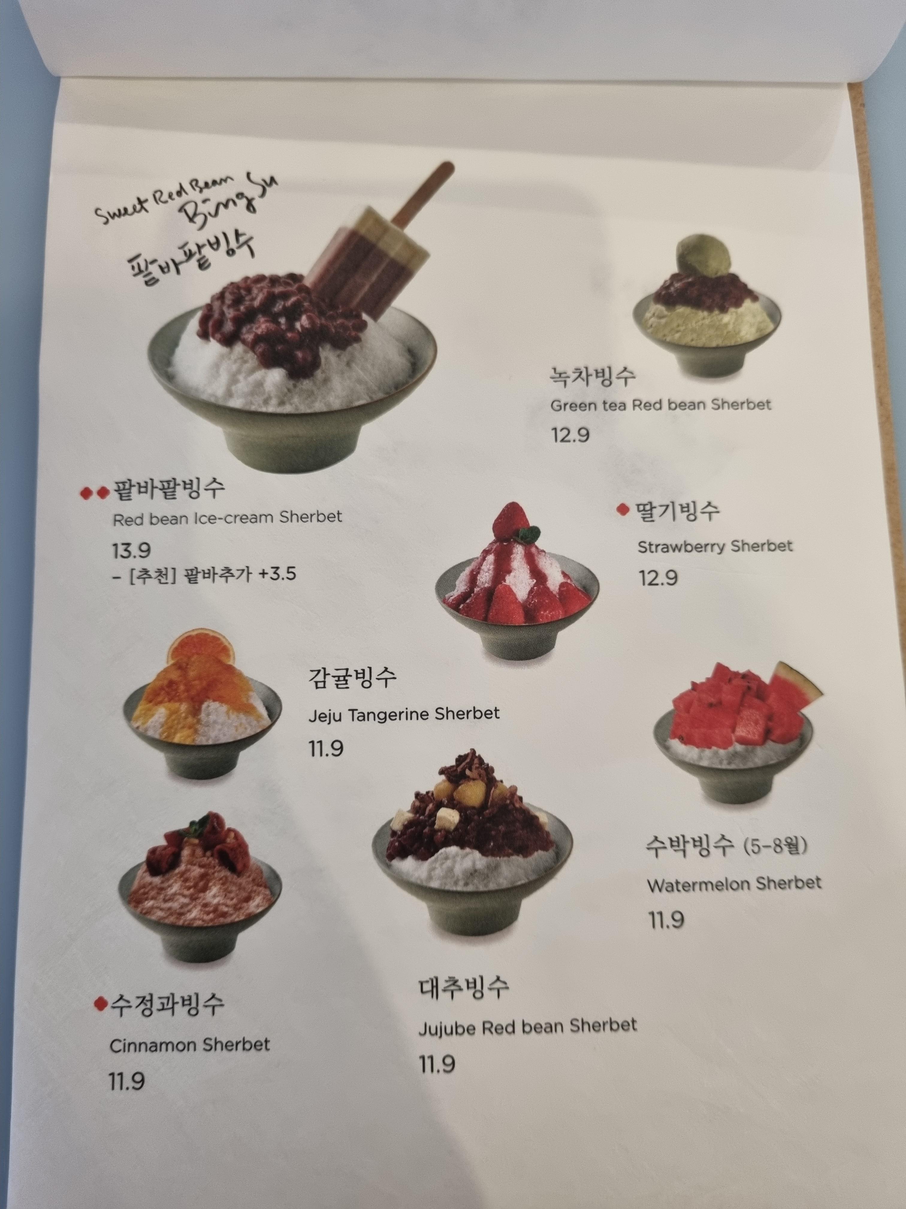 여기도 팥빙수가 3가지로 나뉘어져 있다. 팥죽은 달게 먹기도 하고 아예 설탕을 안 넣어 먹기도 해서 그런지 당도에 따라 구분해 놓은 것도 인상깊다.