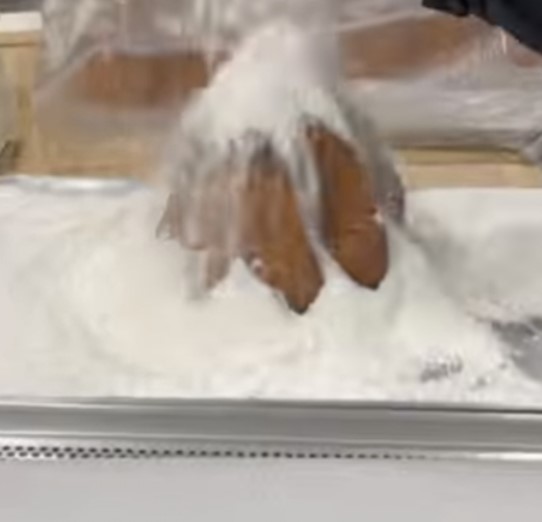 뾰족하게 설산모양을 만드는 모습. 하얗게 눈처럼 뿌려지는 슈가파우더가 인상깊다.