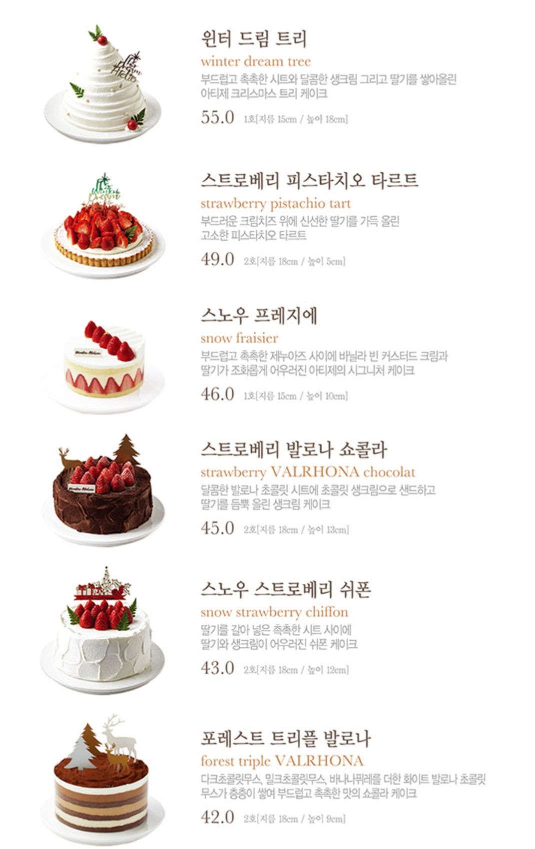 윈터드림트리 55000원 / 스트로베리 피스타치오 타르트 49000원 / 스노우 프레지에 46000원 / 스트로베리 발로나 쇼콜라 45000원 / 스노우 스트로베리 쉬폰 43000원 / 포레스트 트리플 발로나 42000원