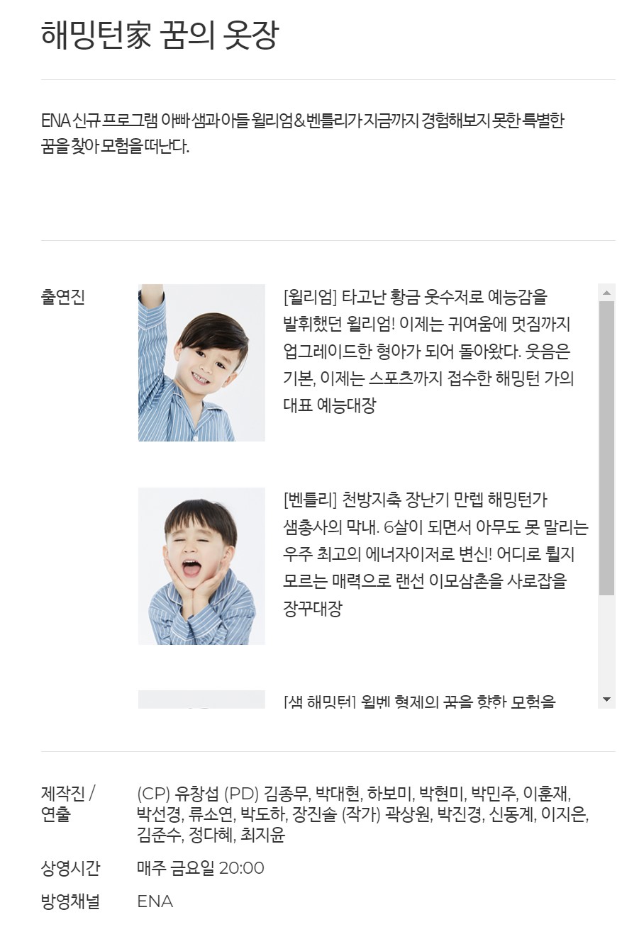 슈퍼맨이돌아왔다가 윌리엄과 벤틀리의 성장과정을 지켜보는 관찰예능이었다면, 이번 해밍턴가 꿈의 옷장은 실제로 윌리엄과 벤틀리가 경험하는 입장에서 그걸 관찰하는 예능이라고 보면 되겠다. 뭔가 더 특별한 경험에 포커스를 맞춘 셈이다.
