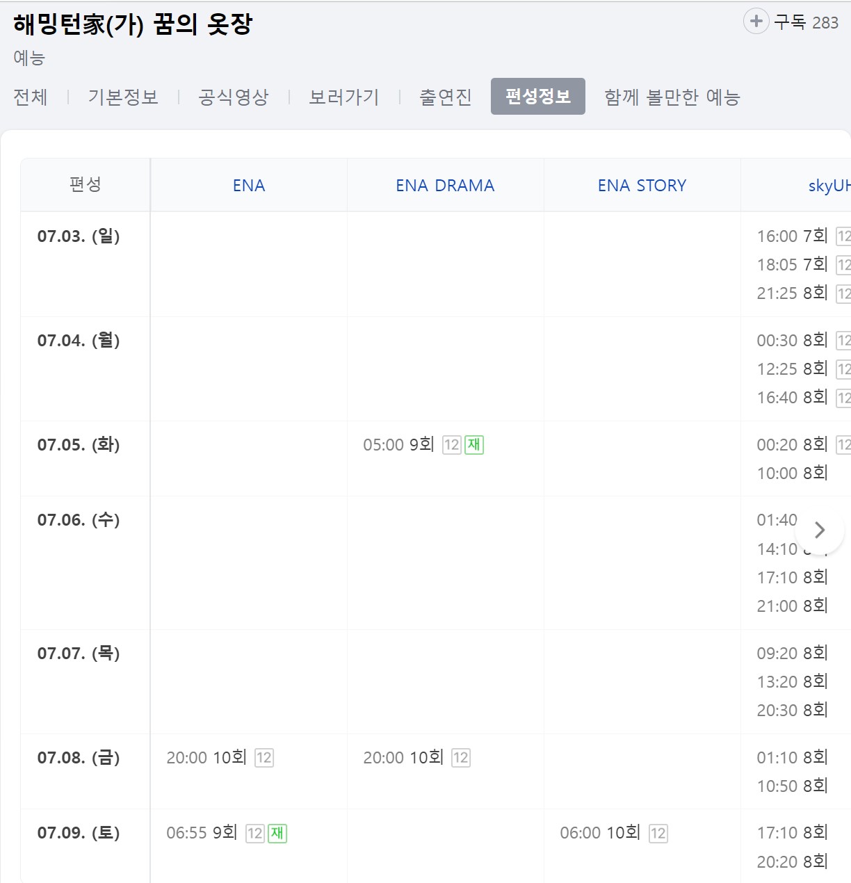 1일 2~4회정도 방영되며 최신작을 가장 빠르게 보고 싶다면 토요일 아침 6시에 ENA STORY채널을 통해 보면 된다.