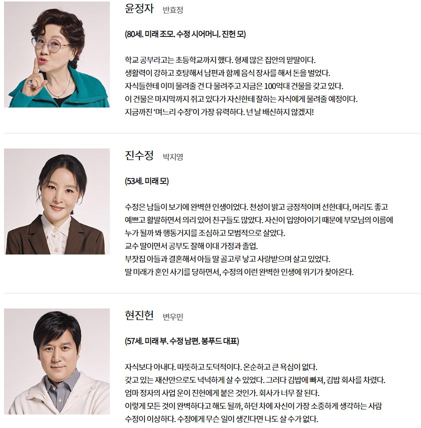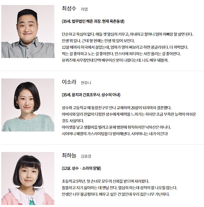 미래네 가족은 할머니(반효정), 아버지(변우민), 어머니(박지영), 남동생(현정후)로 구성되어 있다.