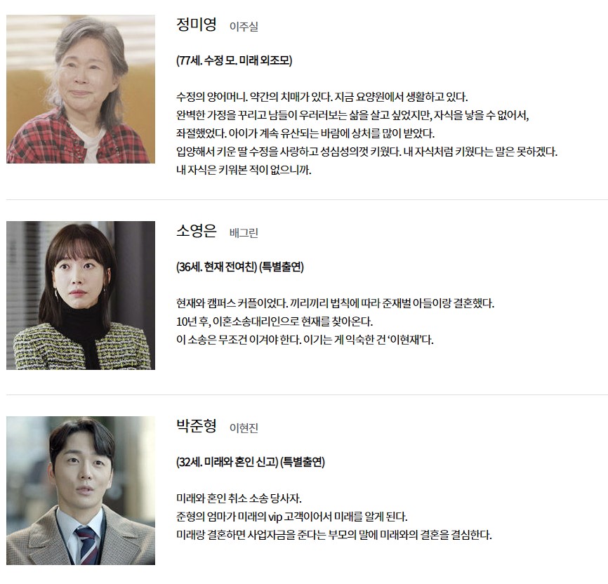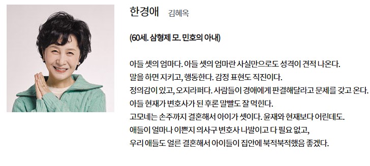 변호사로 나와서, 초반에 미래의 이혼을 담당해주면서 서로 얼굴을 익히게 된다.