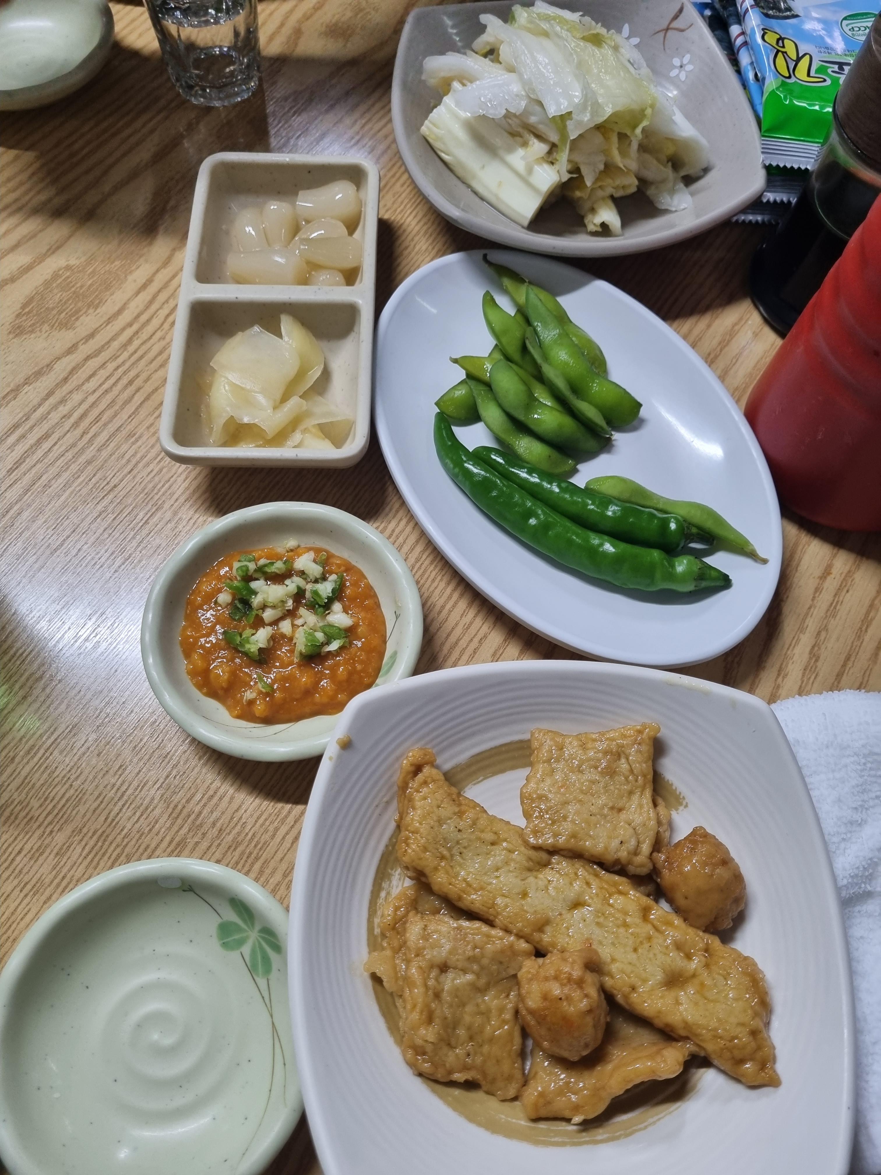 쌈장, 생강초절임, 락교, 삶은콩, 고추, 어묵반찬, 백김치, 초장