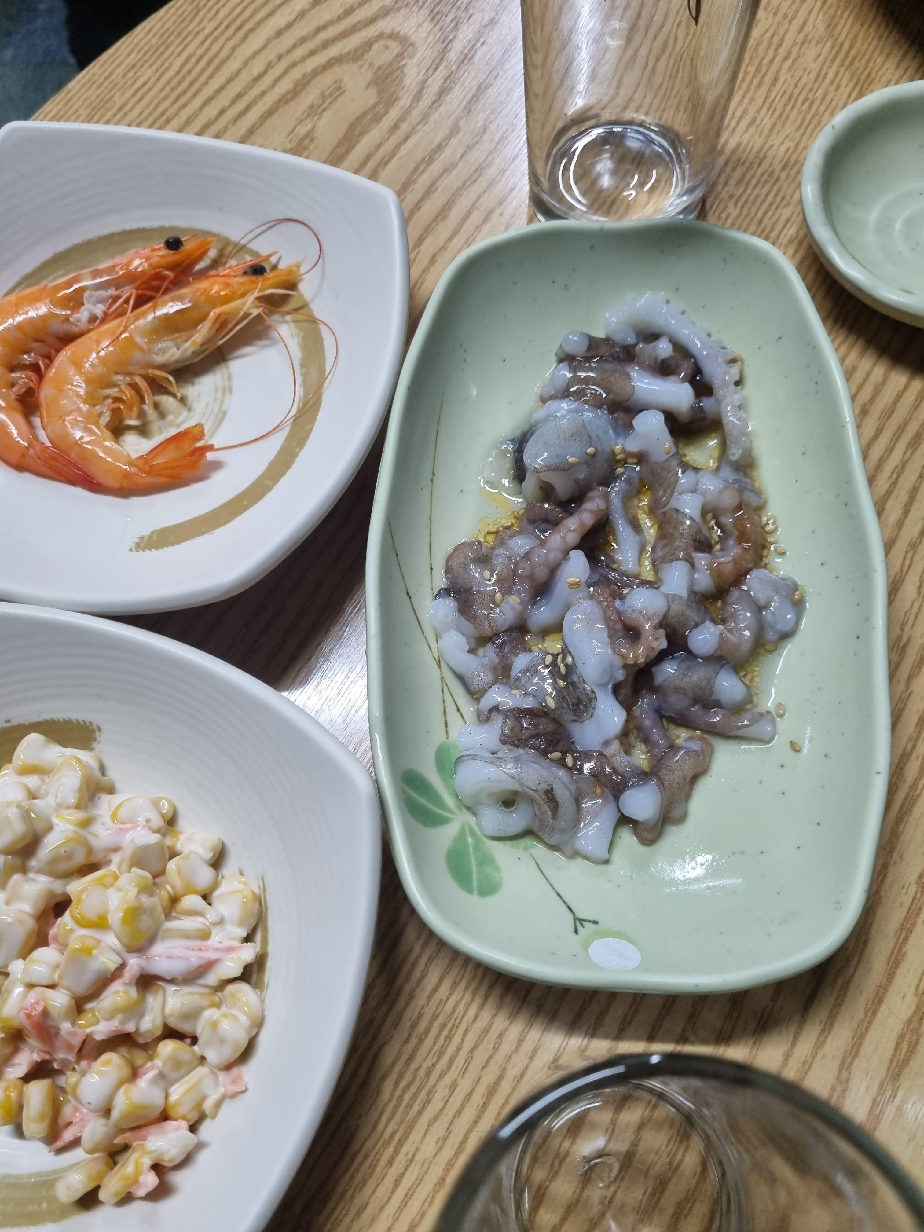 삶은새우, 콘샐러드, 산낚지 를 주신다.