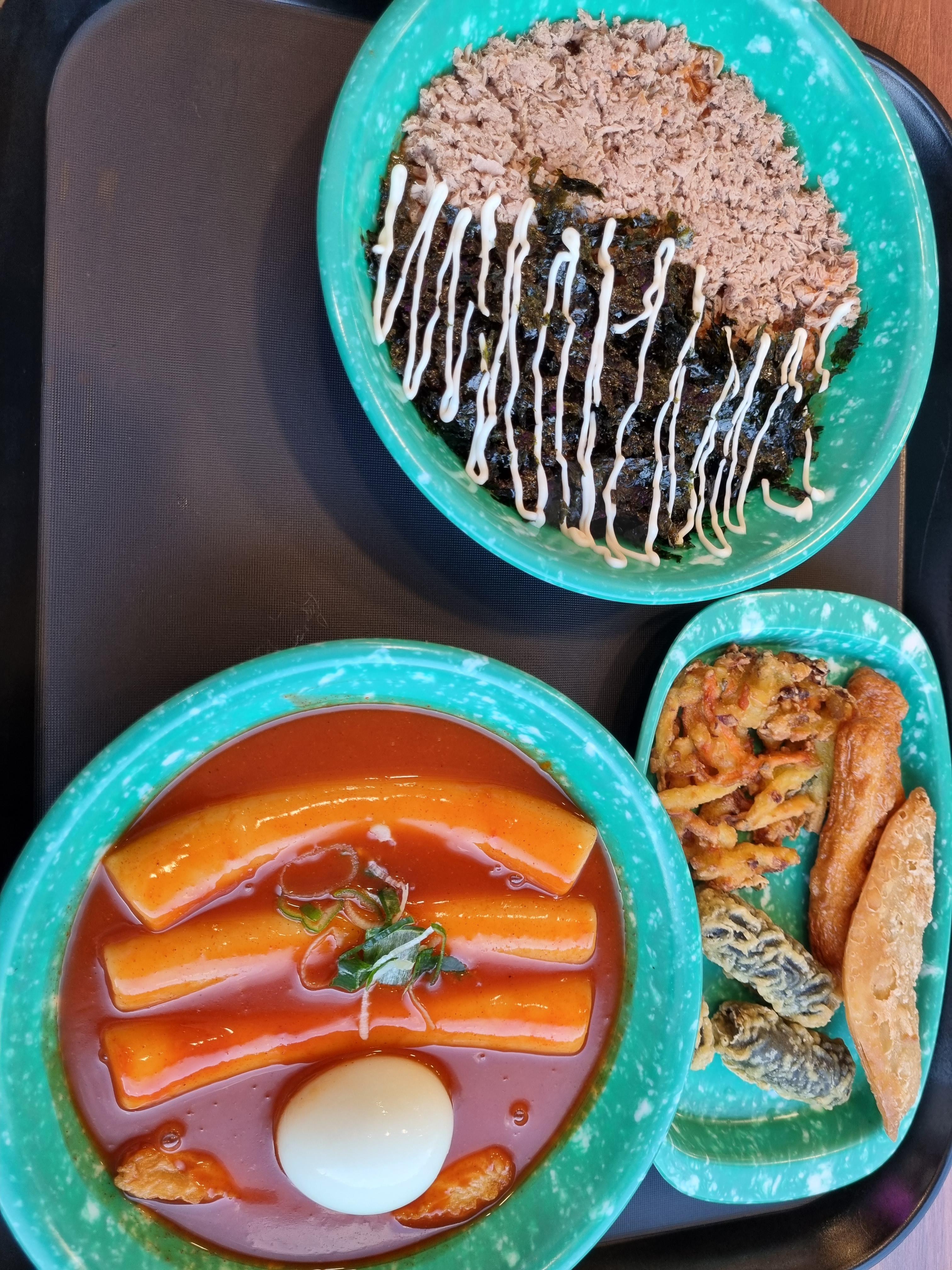 밥 한그릇인데 3500원이라니. 저렴하다. 국물비빔밥이 뭔가 싶었는데 알고보니, 떡볶이 국물 비빔밥! 밥 위에 떡볶이 국물을 뿌리고, 그 위에 참치와 김, 마요네즈를 올렸다. 참치가 안올려진 일반 국물비빔밥은 2500원이라 가성비가 더 좋다. 떡볶이 국물과 밥을 비벼먹으니 즉석떡볶이를 먹고 비벼먹는 볶음밥 같은 맛이었다. 비록 볶음밥처럼 꼬들하진 않고 촉촉하지만. 그래도 배고플때 이만한게 있을까 싶다.