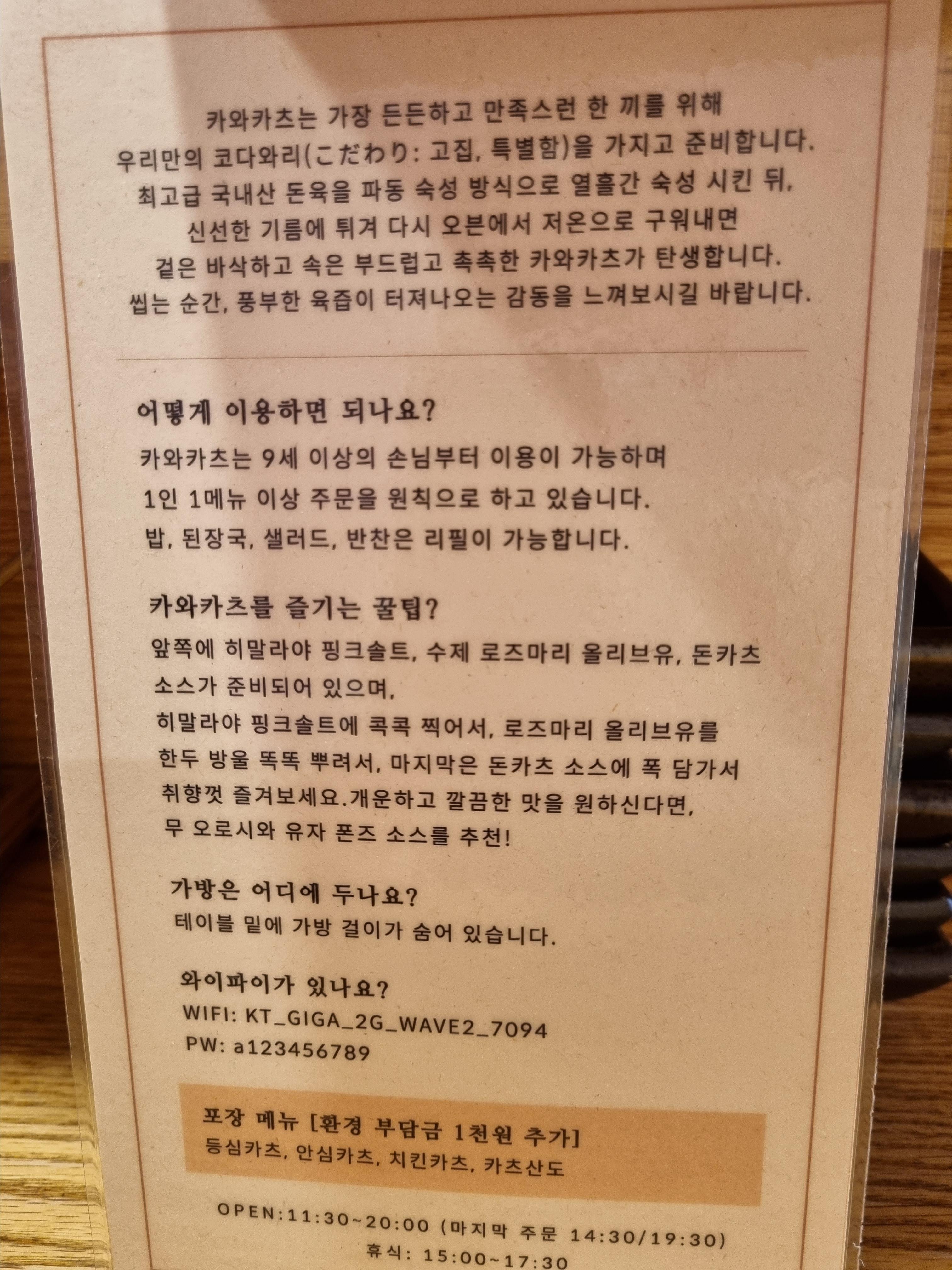 카와카츠 메뉴는 총 8가지인데, 사실 점심에 방문하는게 아니면 저걸 다 먹기는 힘들다. 브레이크타임이 끝나고 6번째로 들어갔는데 히레주문 마지막이었다. 특로스와 모둠카츠는 아예 주문이 안된다. 웨이팅했다고 다 먹을 수 있는게 아니니 참고해야한다. 직원분께서 그 다음 분들께는 전화로 지금 히레는 안된다고 안내를 해주신다.