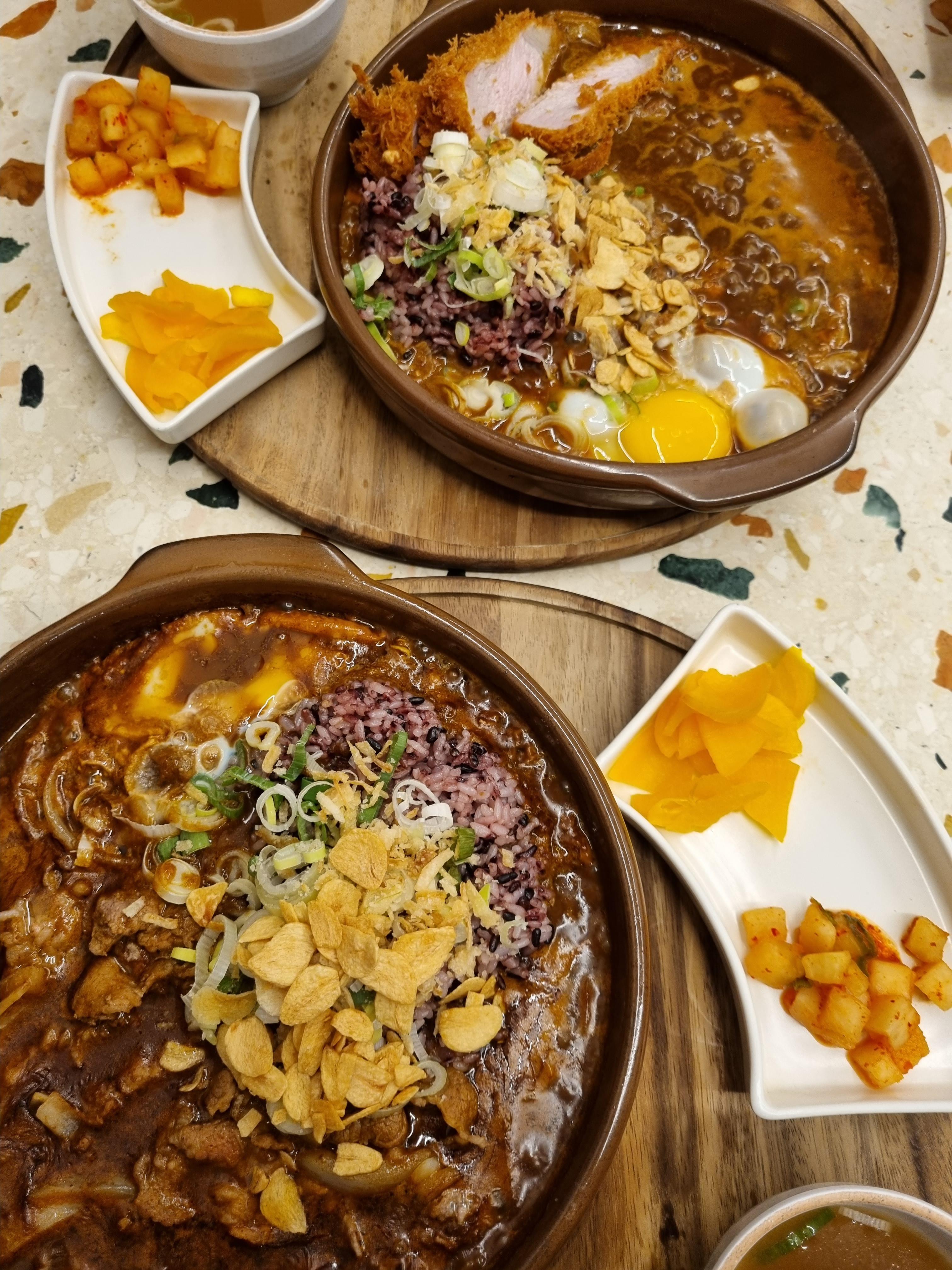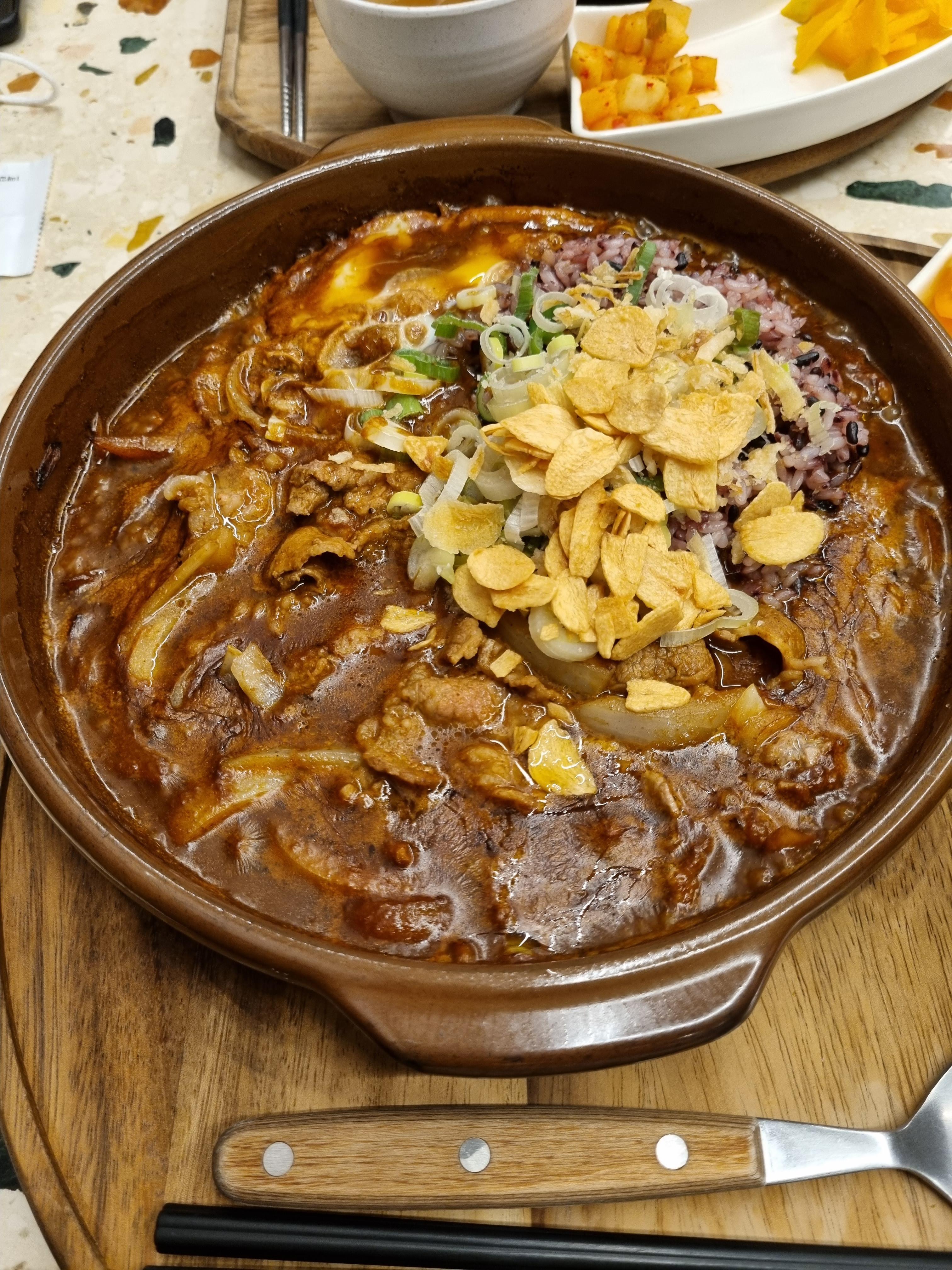 넓은 뚝배기 그릇 같은 곳에 서빙되어 나오는데, 이 뚝배기 심상치 않았다. 밥을 일단 아래에 깔고, 돌솥비빔밥처럼 눌렀는지 누룽지가 군데군데 있었고 이걸 섞어서 먹으면 된다고 안내해주셨다. 카레에 누룽지맛이라니. 좀 색다르게 느껴졌다.