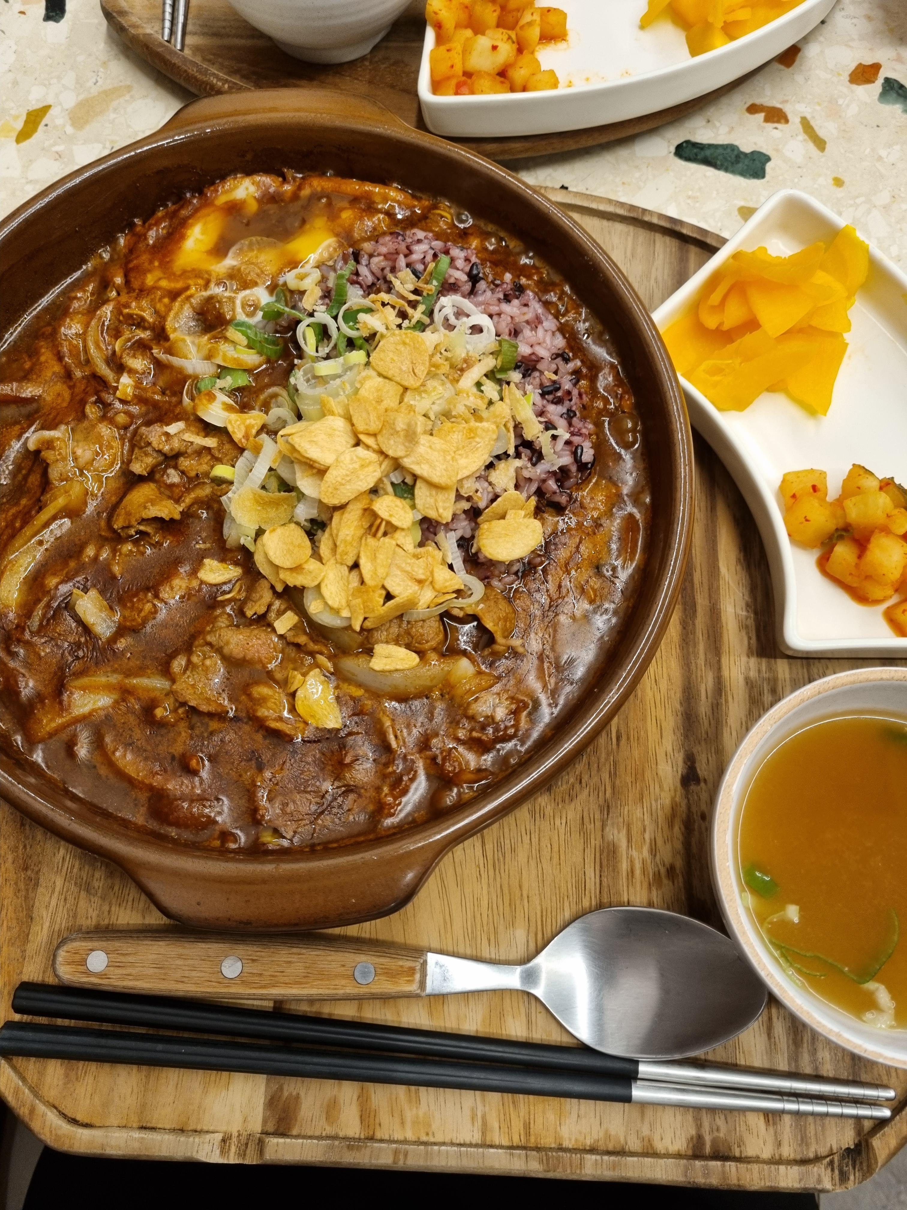 넓은 뚝배기 그릇 같은 곳에 서빙되어 나오는데, 이 뚝배기 심상치 않았다. 밥을 일단 아래에 깔고, 돌솥비빔밥처럼 눌렀는지 누룽지가 군데군데 있었고 이걸 섞어서 먹으면 된다고 안내해주셨다. 카레에 누룽지맛이라니. 좀 색다르게 느껴졌다.