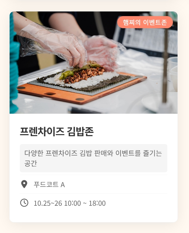 이밖에 김밥 관련 플리마켓과 김밥 판매, 로컬김밥판매, 김밥의 영원한 친구인 분식들을 판매하는 존, 김밥 놀이동산 등을 운영합니다.