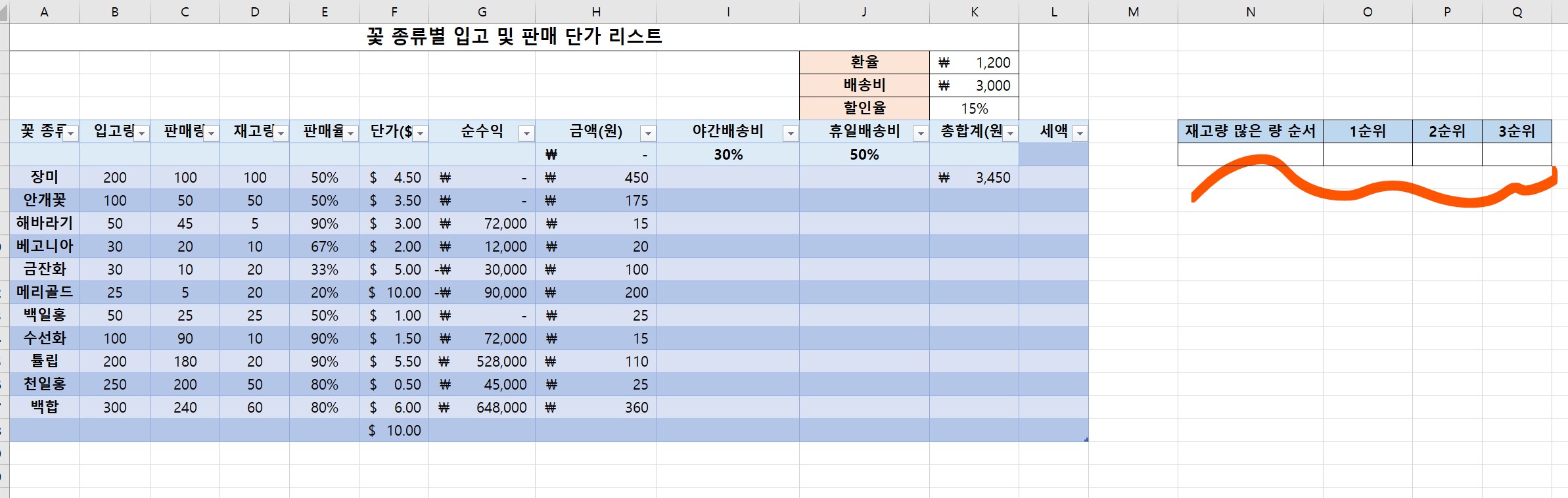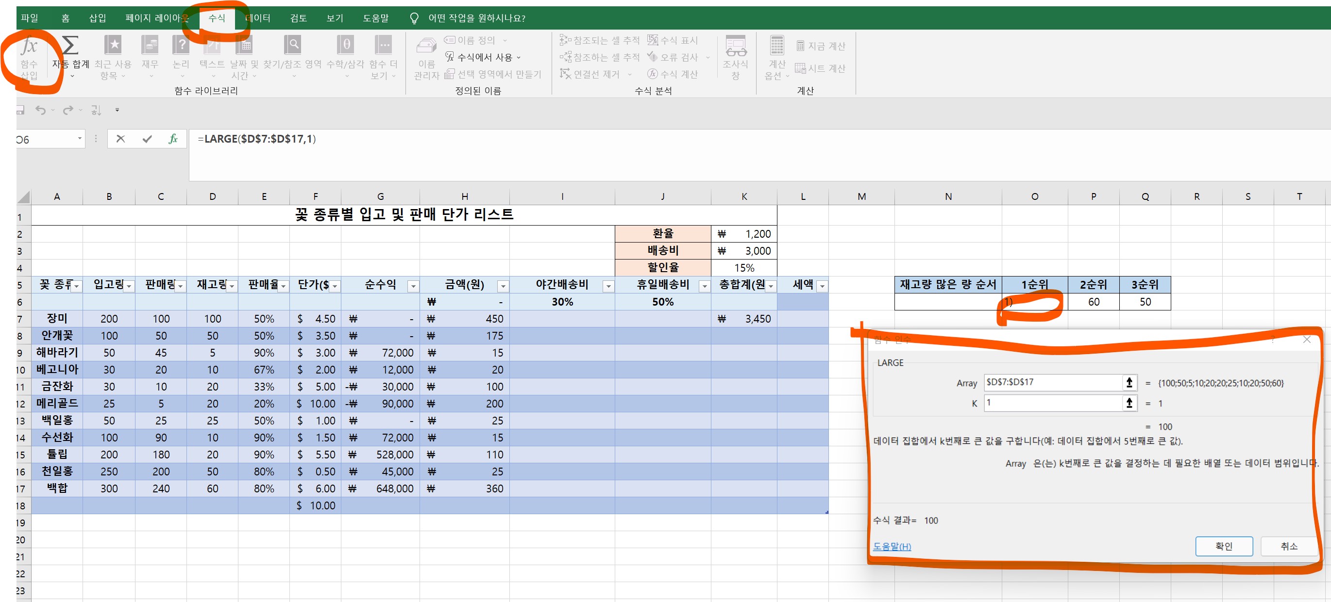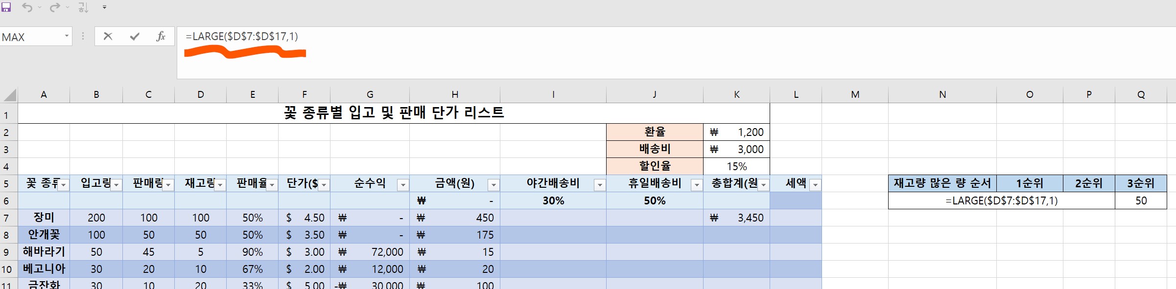 LARGE 함수를 이용해서 재고량이 많은 순서대로 값을 구해보려고한다.